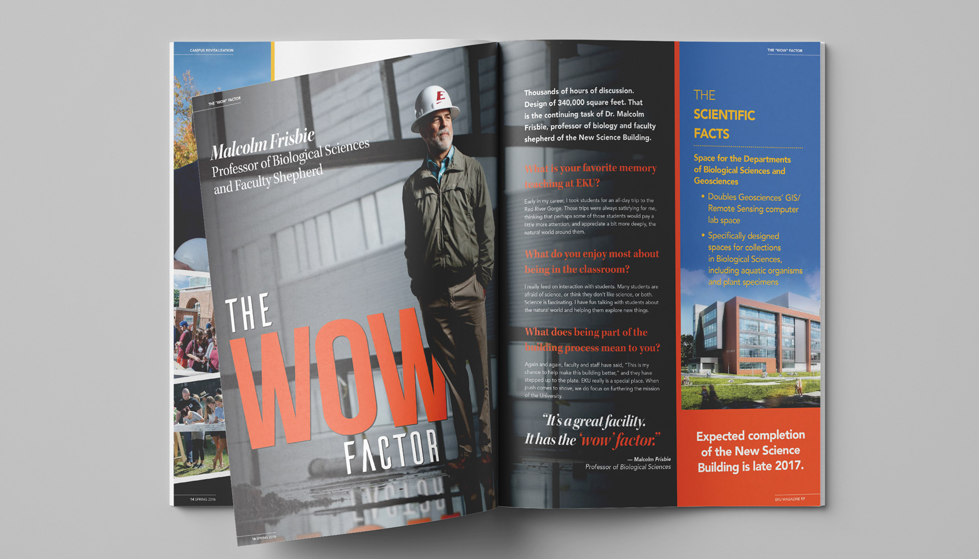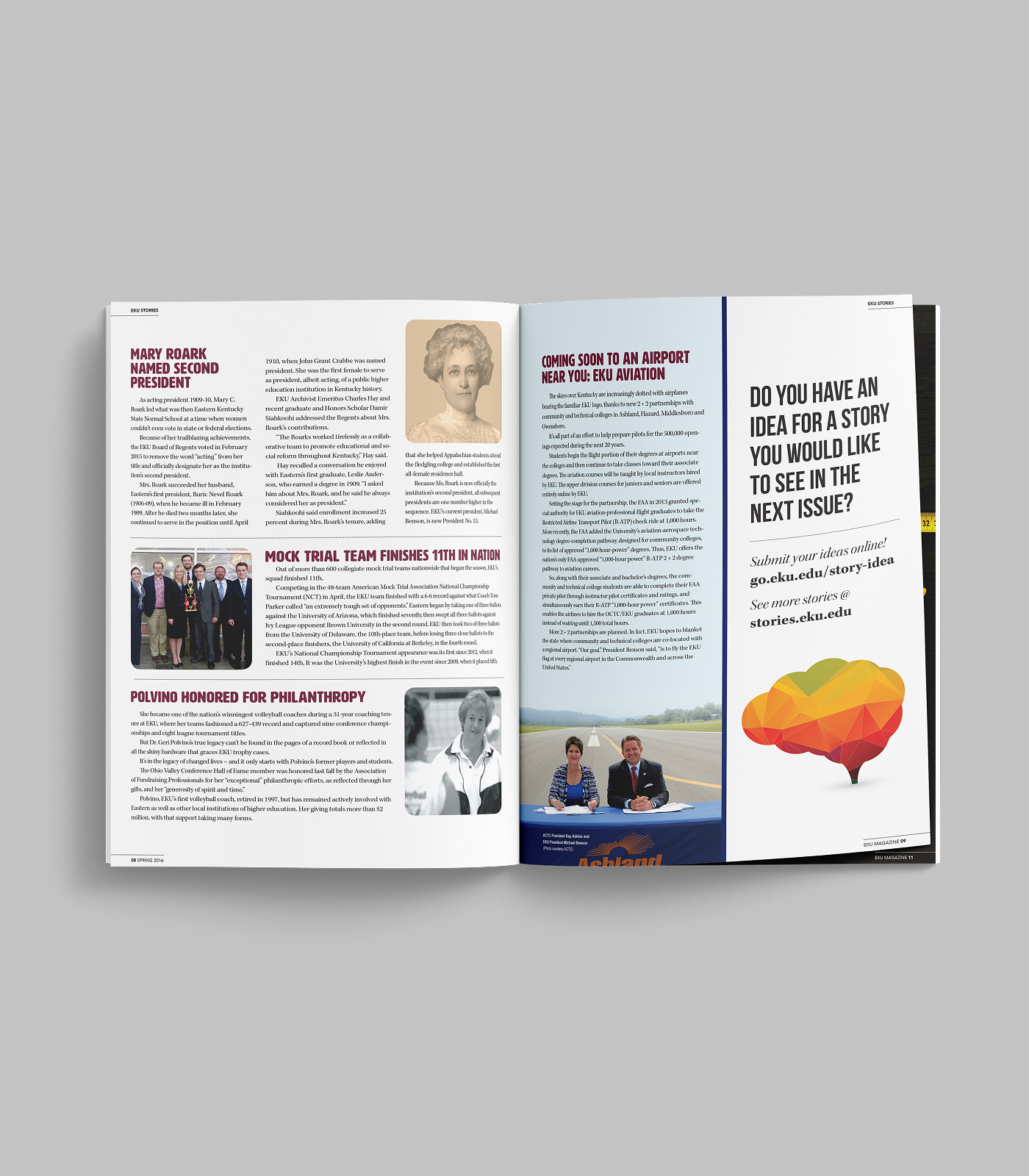 This project was done while working as the first Art Director for my alma mater, Eastern Kentucky University. One of my main goals was to bring the alumni magazine, previously outsourced to a design agency, back in-house and produce all stories, interviews, graphics, and photography with the help of the marketing department, alumni association, faculty, and the students of EKU. The alumni magazine ended up being 45+ pages which were printed and distributed in-house through EKU Printing Services.