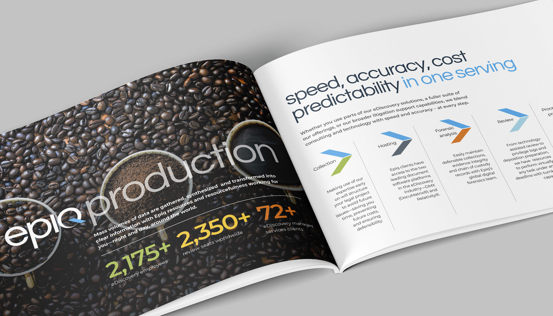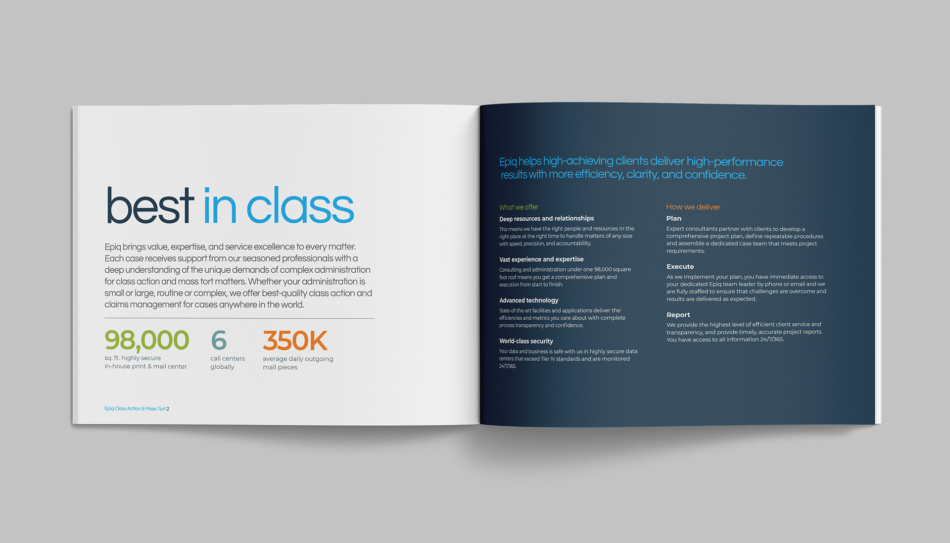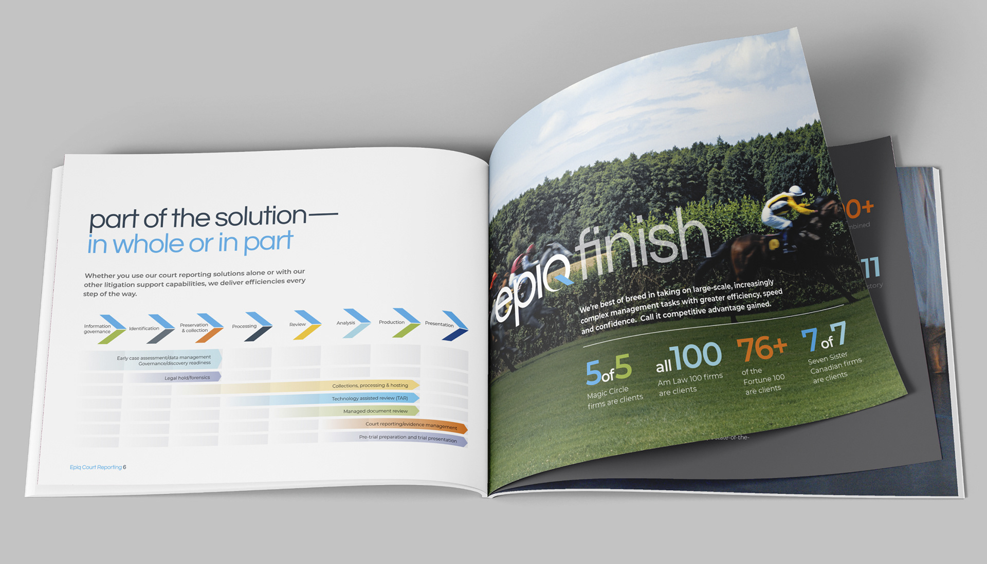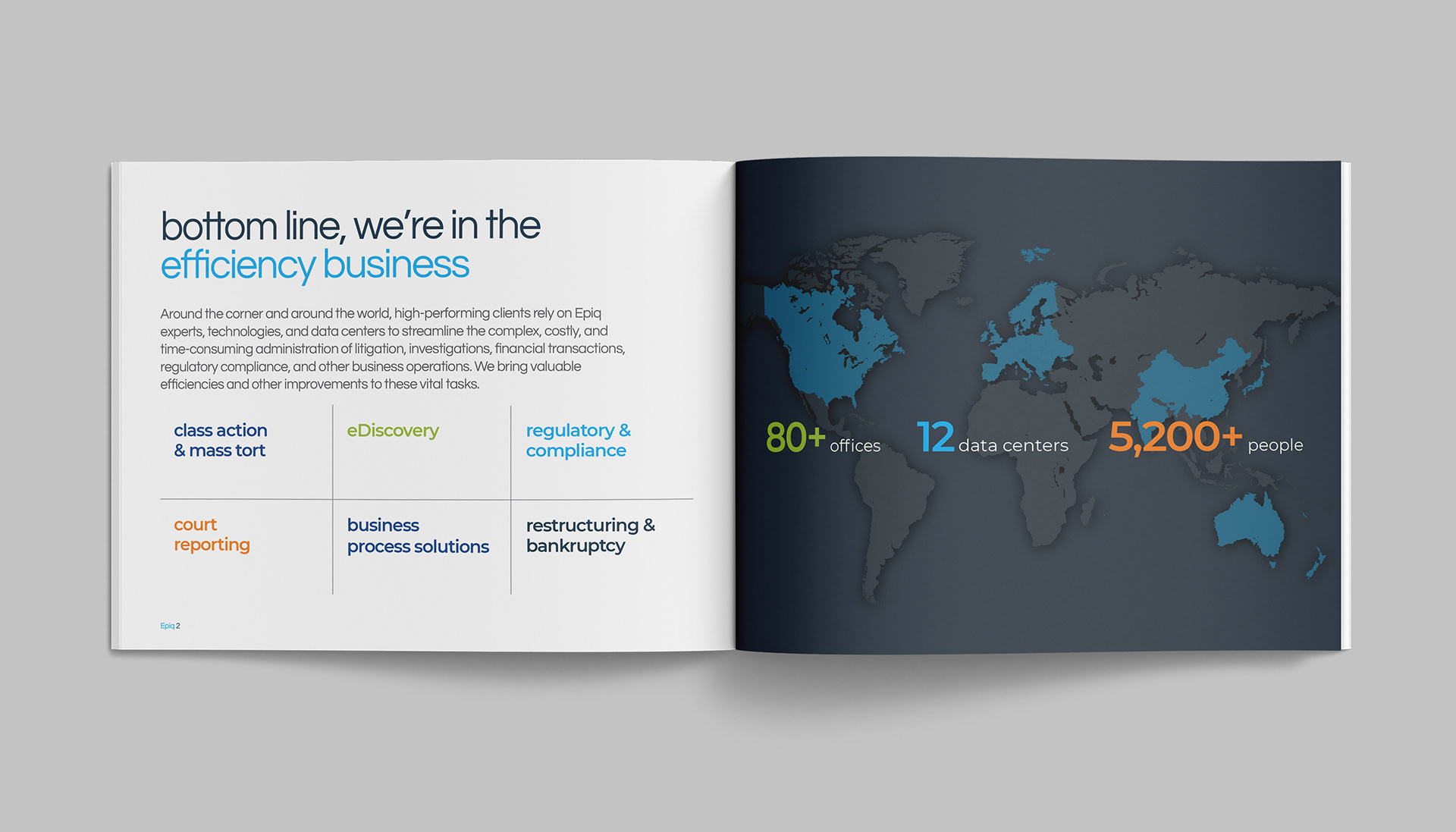 Epiq Global is a worldwide provider of legal and business services serving law firms, corporations, financial institutions, and government agencies. This project consists of a series of brochures highlighting their industries and services: business operations, class action and mass tort, court reporting, eDiscovery, regulatory, compliance, restructuring, legal transformation, and bankruptcy matters. My role was to take the newly redesigned Epiq Global brand and extend it into a modular brochure system flexible enough for future business growth and new services as Epiq Global expands.
