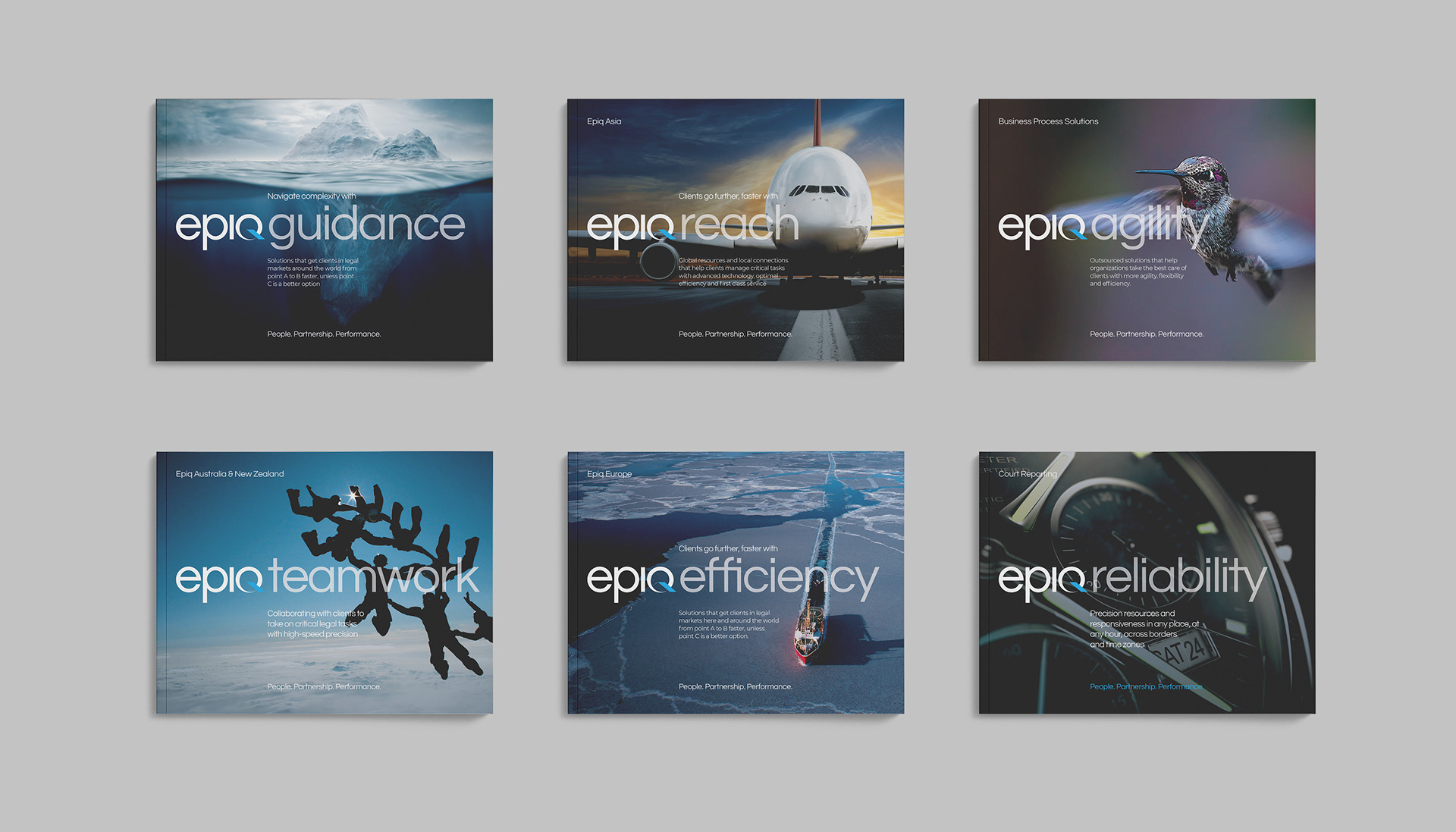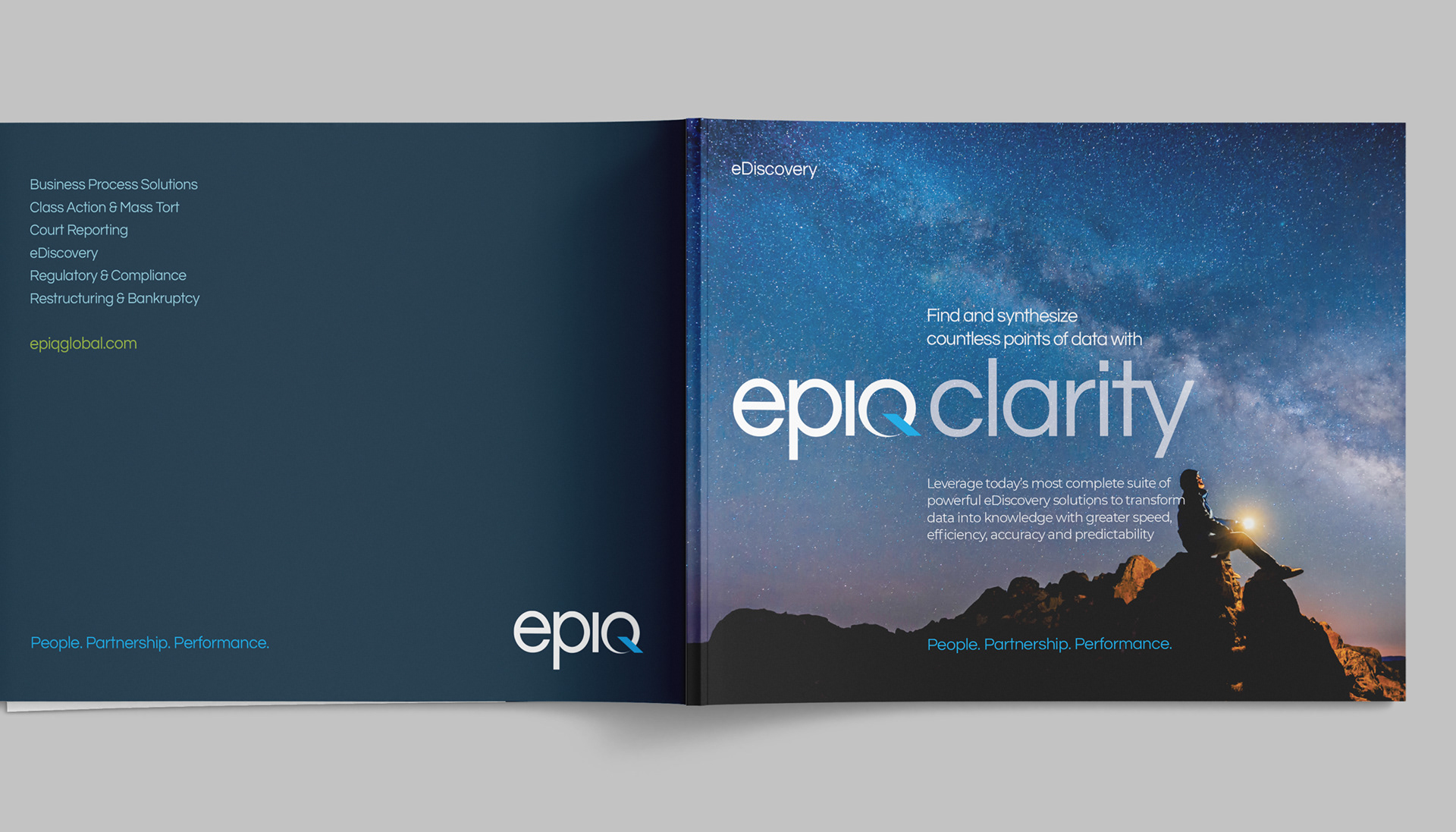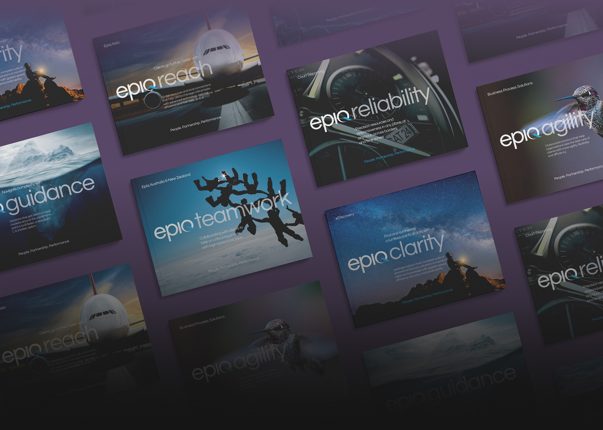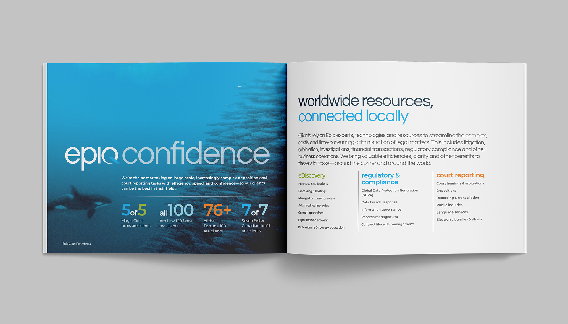 Epiq Global is a worldwide provider of legal and business services serving law firms, corporations, financial institutions, and government agencies. This project consists of a series of brochures highlighting their industries and services: business operations, class action and mass tort, court reporting, eDiscovery, regulatory, compliance, restructuring, legal transformation, and bankruptcy matters. My role was to take the newly redesigned Epiq Global brand and extend it into a modular brochure system flexible enough for future business growth and new services as Epiq Global expands.