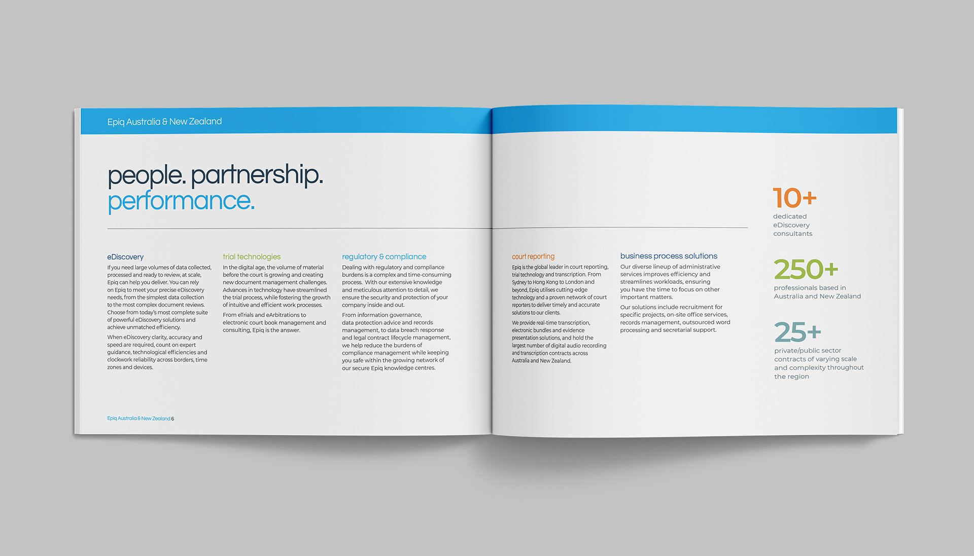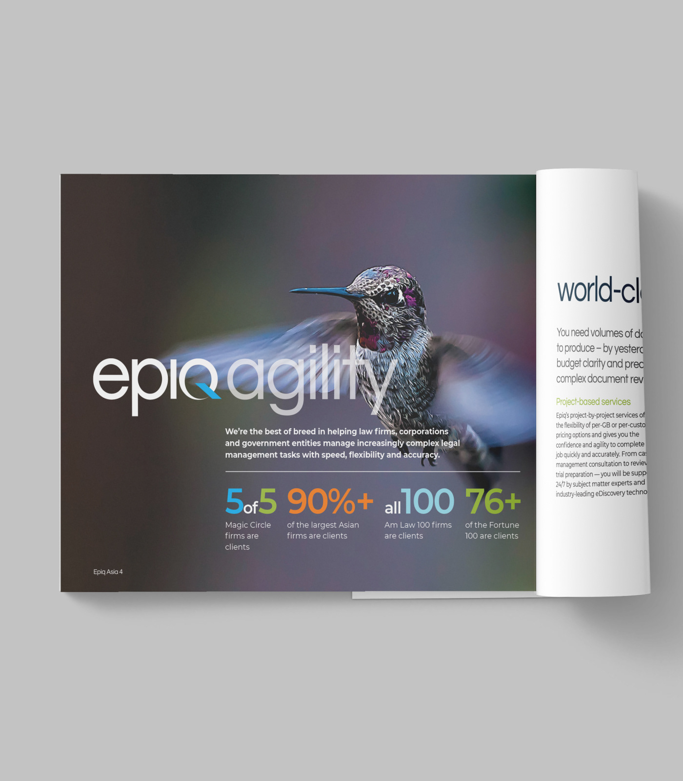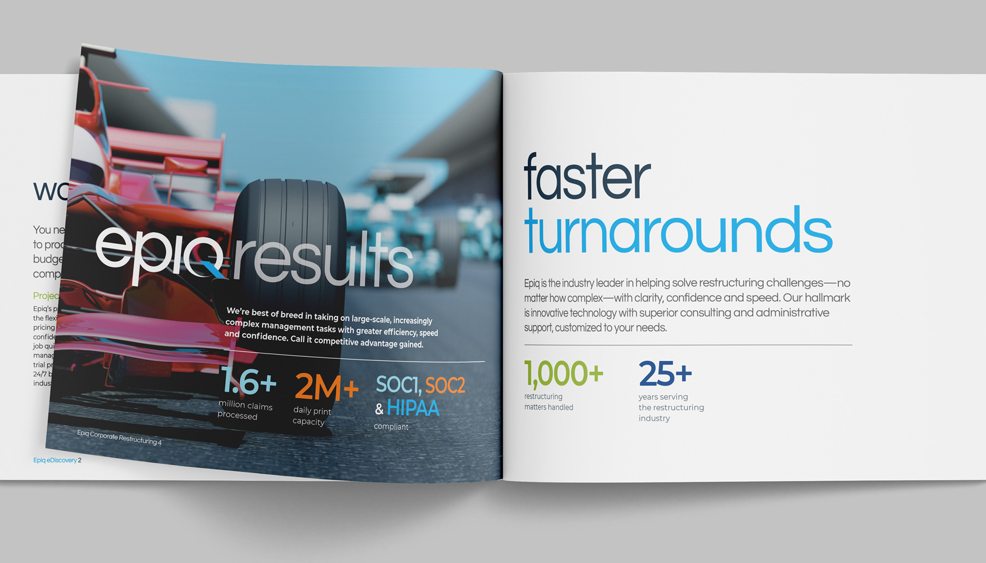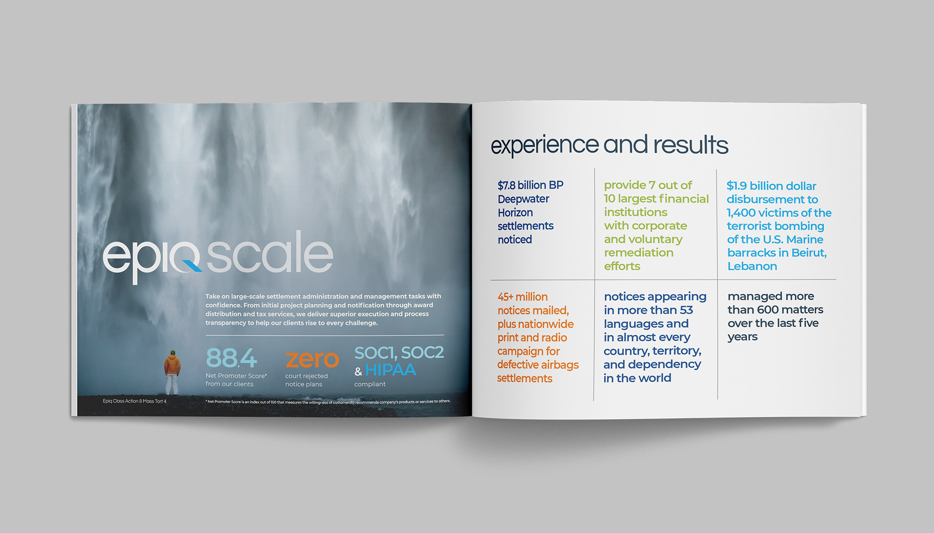 Epiq Global is a worldwide provider of legal and business services serving law firms, corporations, financial institutions, and government agencies. This project consists of a series of brochures highlighting their industries and services: business operations, class action and mass tort, court reporting, eDiscovery, regulatory, compliance, restructuring, legal transformation, and bankruptcy matters. My role was to take the newly redesigned Epiq Global brand and extend it into a modular brochure system flexible enough for future business growth and new services as Epiq Global expands.