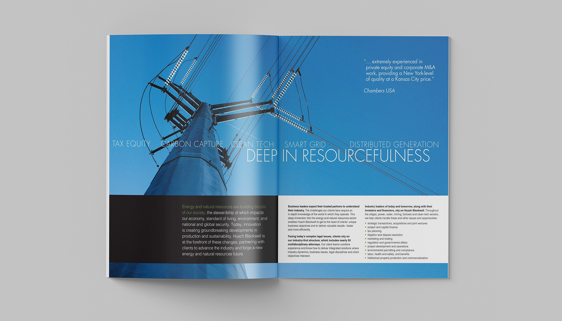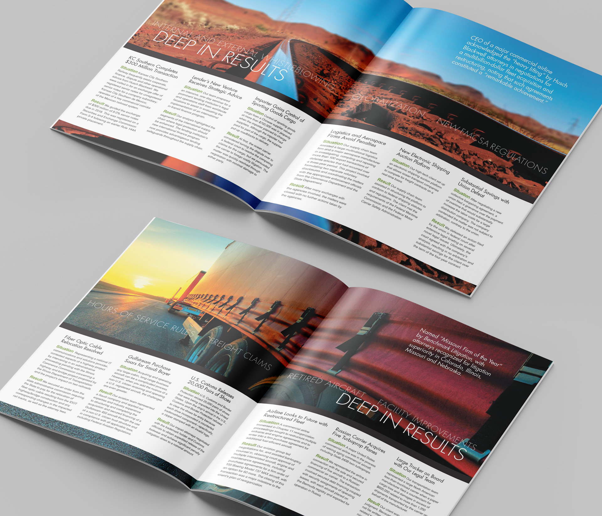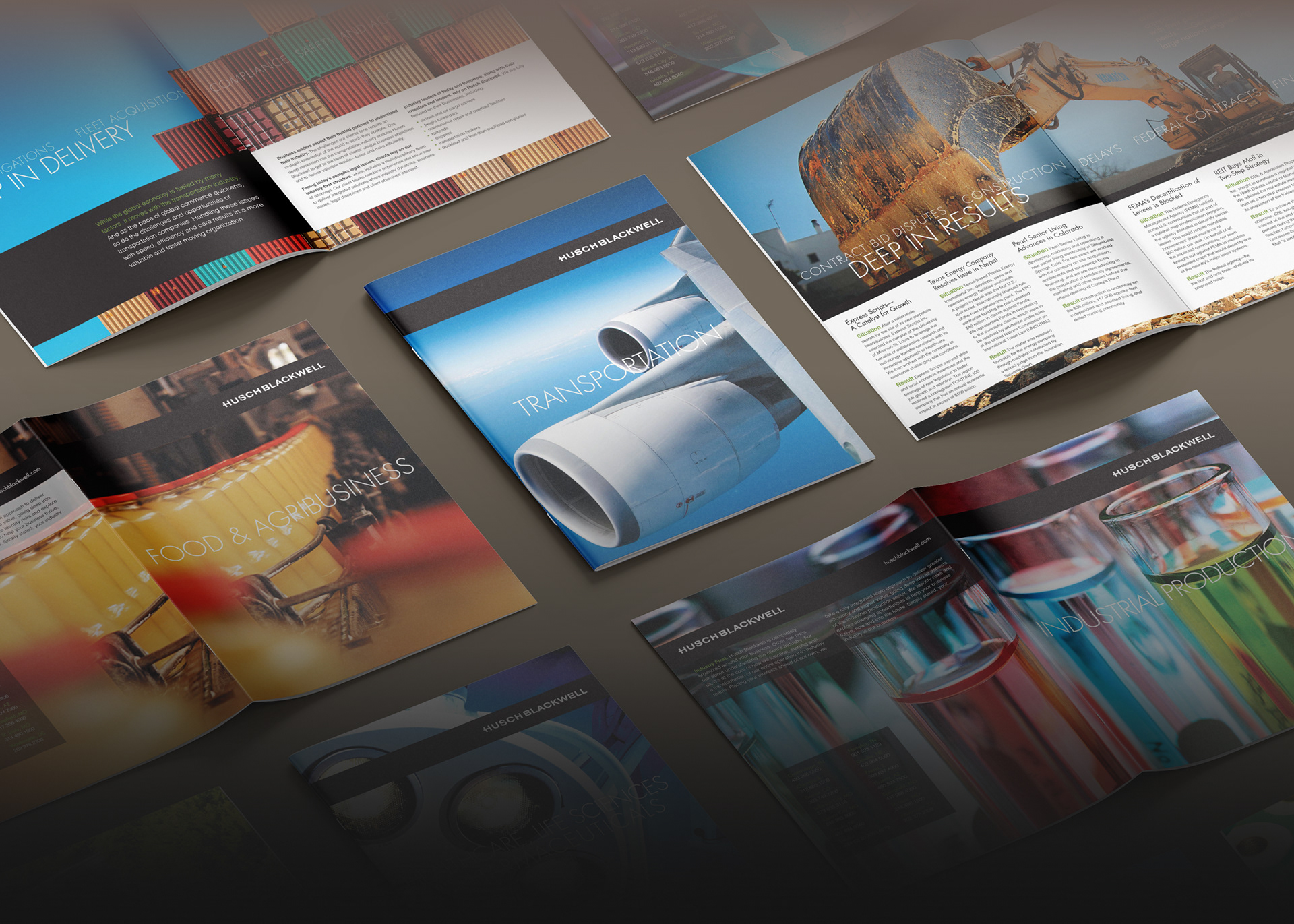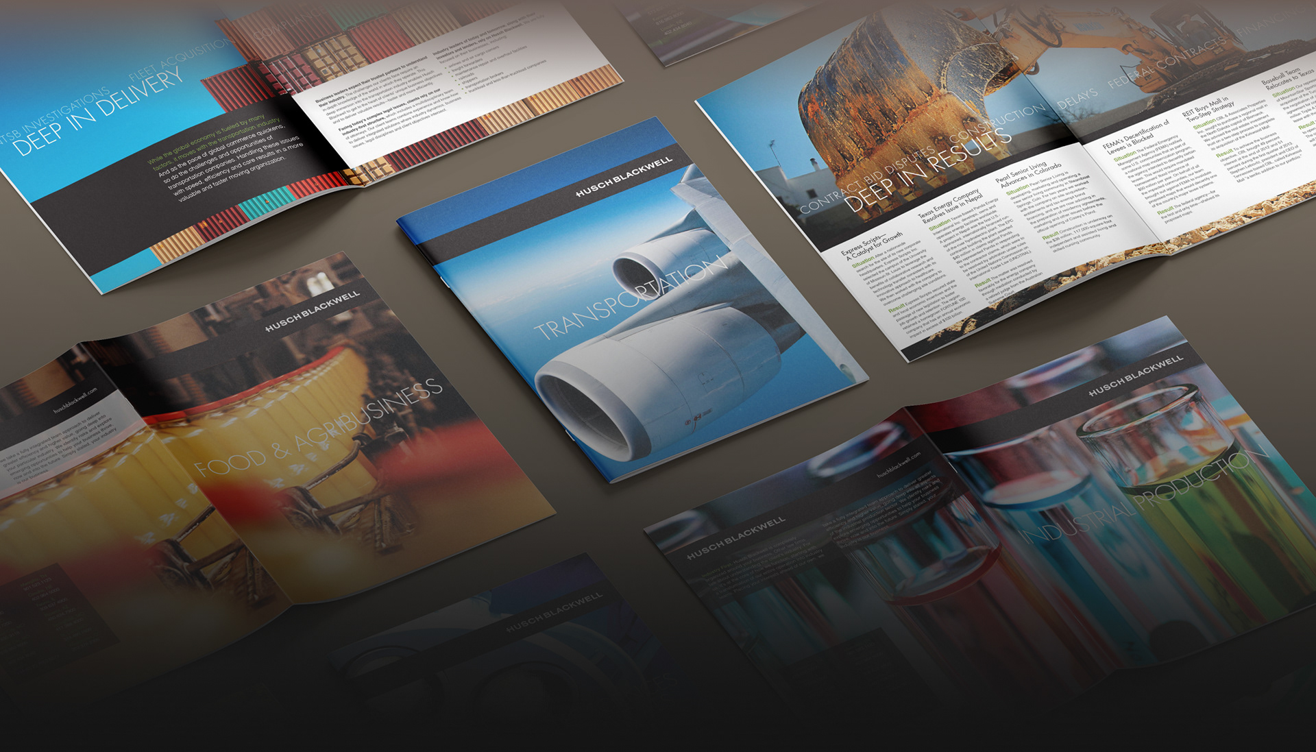 This project consists of a series of brochures highlighting each of Husch Blackwell's industries of focus: Agribusiness, Energy & Natural Resources, Financial Services, Healthcare & Pharmaceuticals, Industrial Production, Real Estate & Construction, Technology, and Transportation.