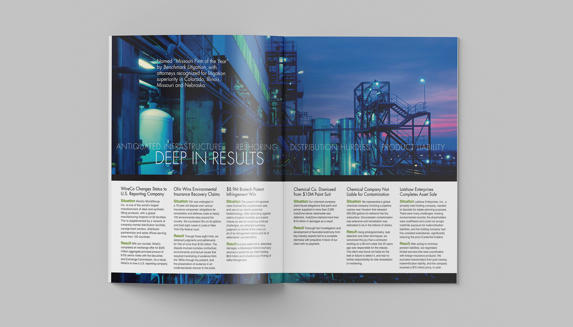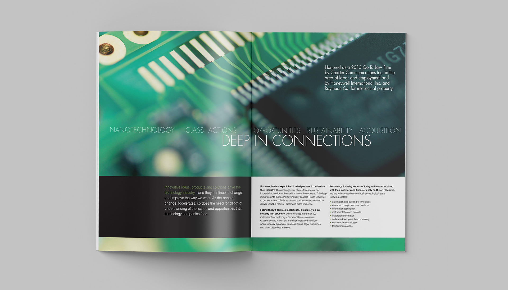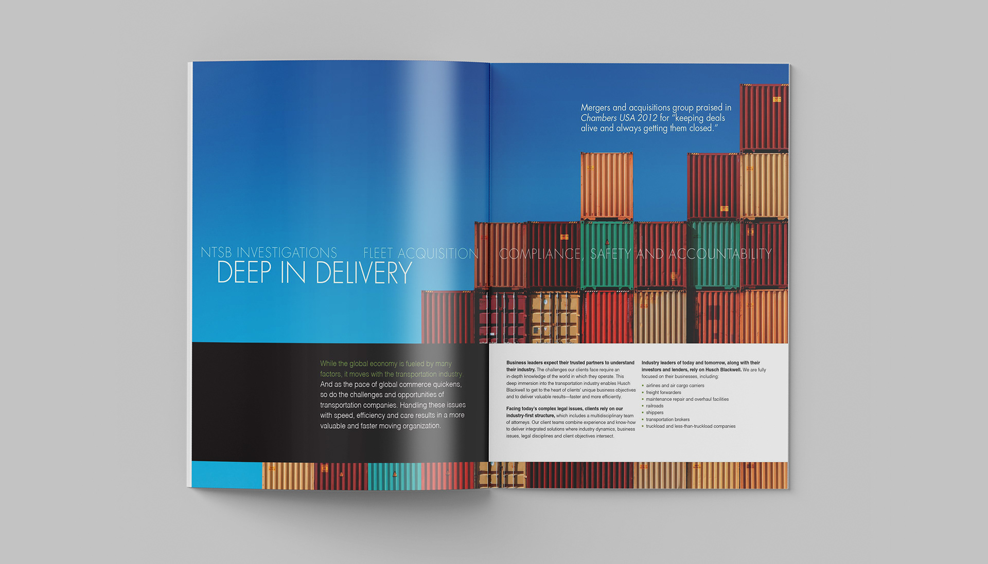 This project consists of a series of brochures highlighting each of Husch Blackwell's industries of focus: Agribusiness, Energy & Natural Resources, Financial Services, Healthcare & Pharmaceuticals, Industrial Production, Real Estate & Construction, Technology, and Transportation.