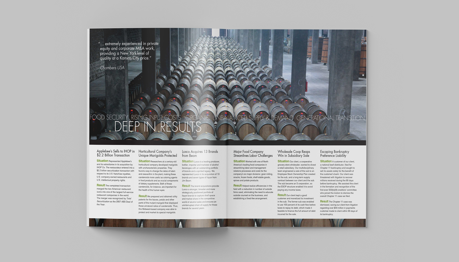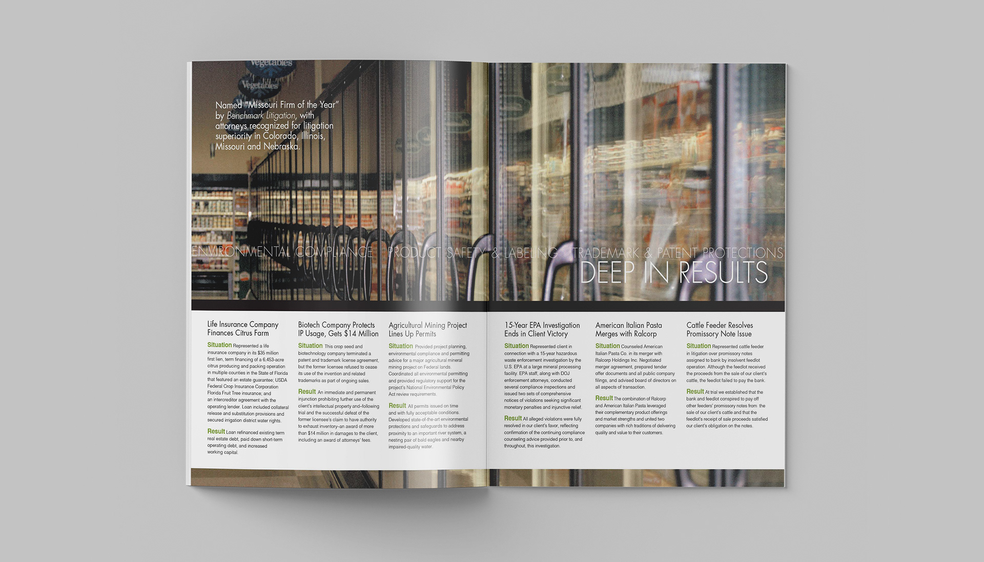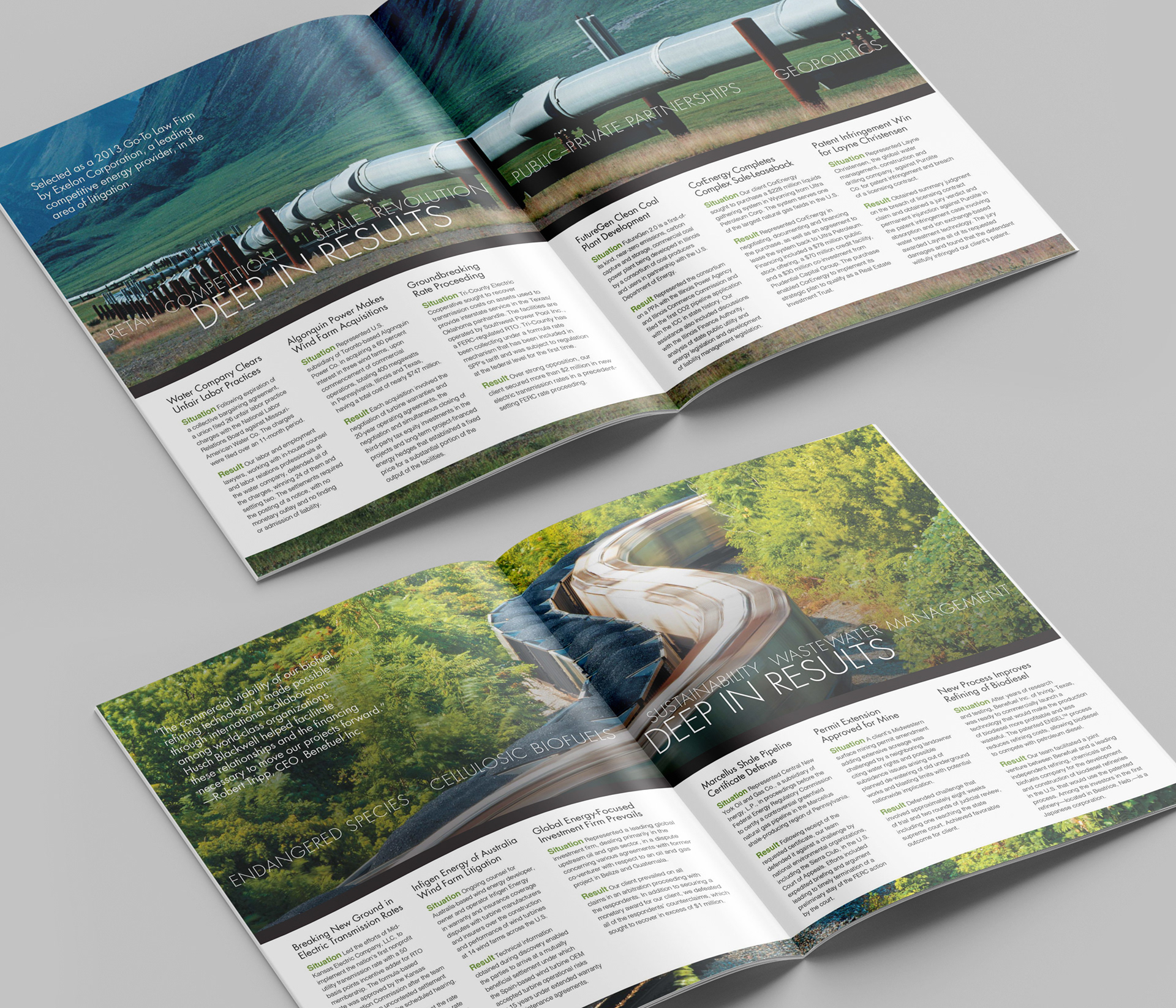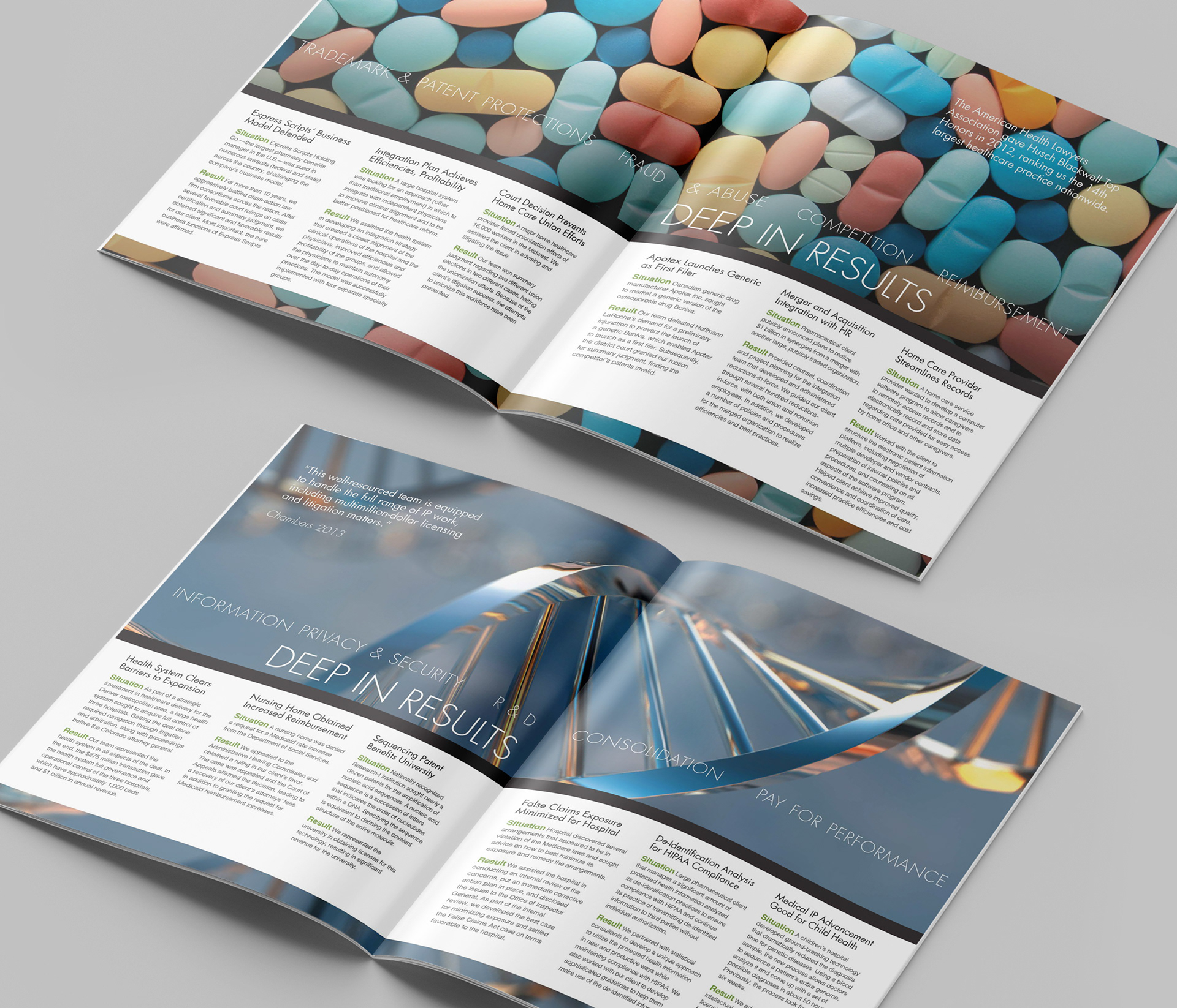 This project consists of a series of brochures highlighting each of Husch Blackwell's industries of focus: Agribusiness, Energy & Natural Resources, Financial Services, Healthcare & Pharmaceuticals, Industrial Production, Real Estate & Construction, Technology, and Transportation.