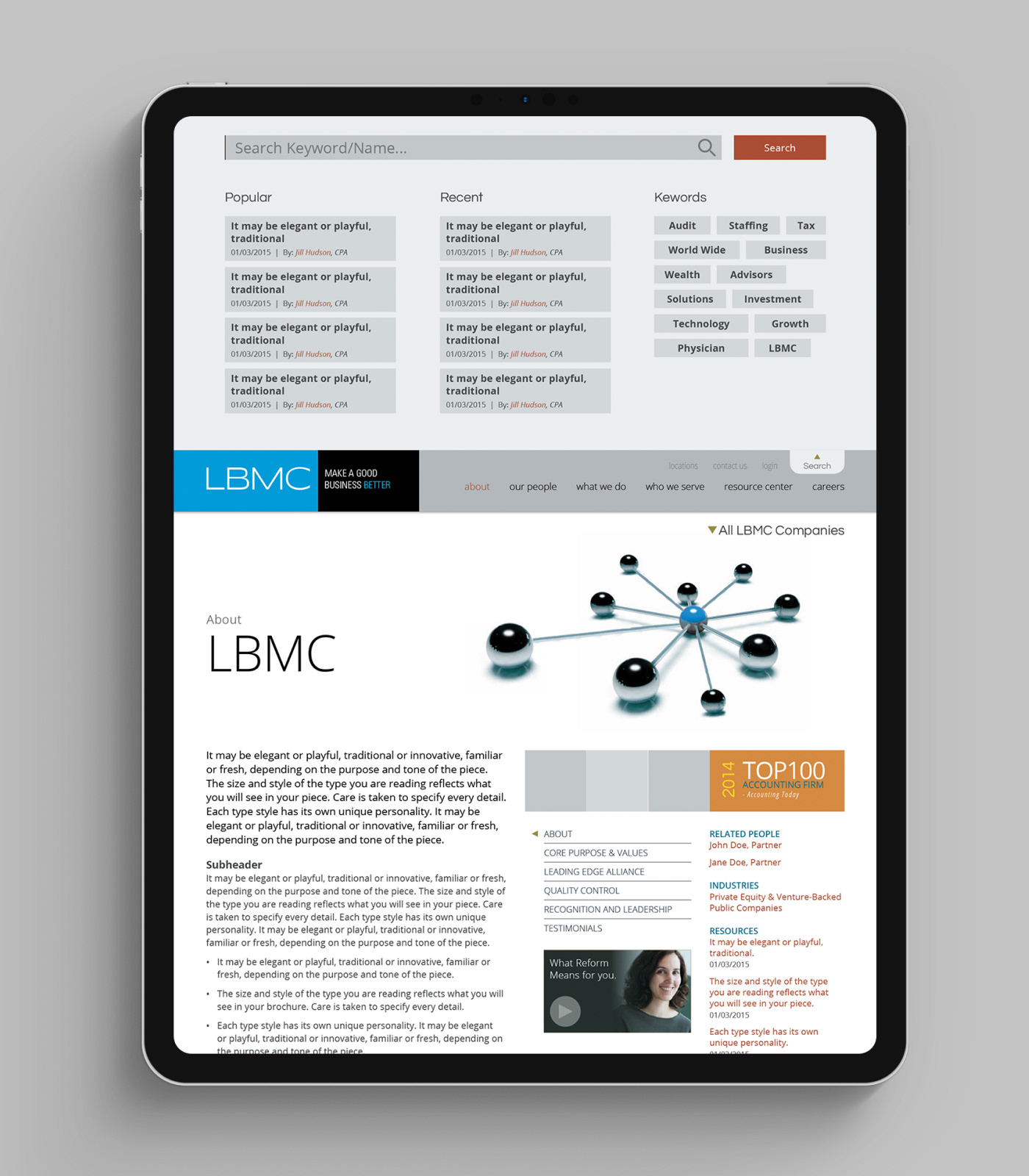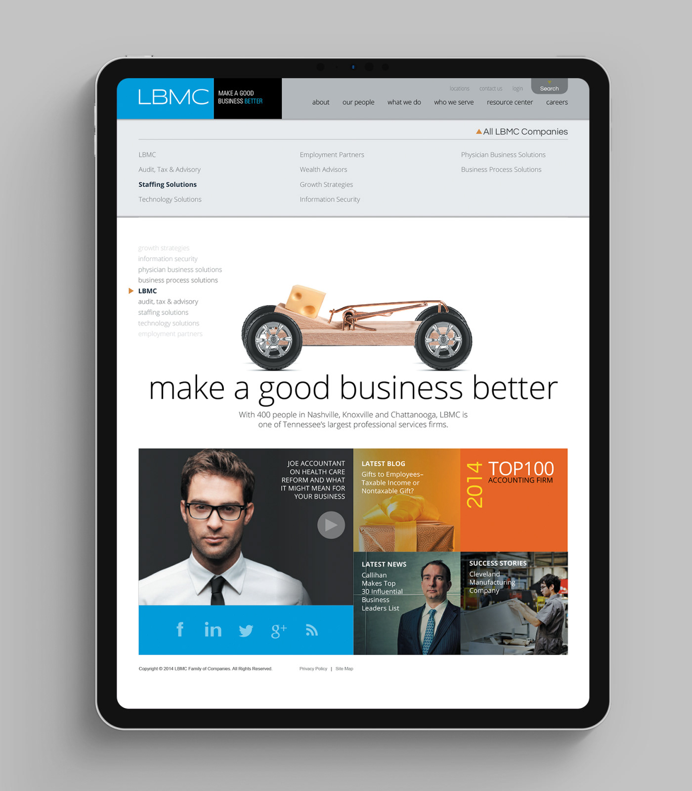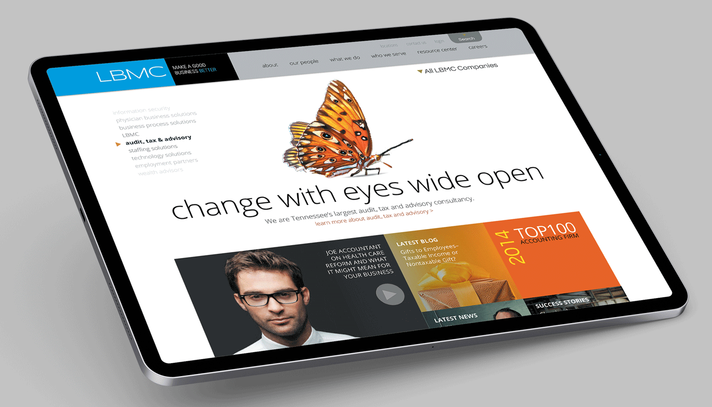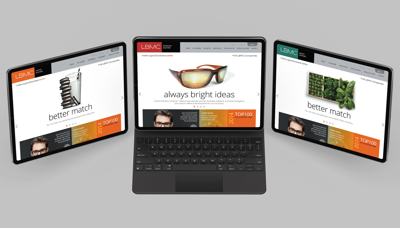 This project is a redesign of the LBMC Website. My role was to take the newly redesigned LBMC brand and flesh out a full responsive corporate website that would encompass all 9 of LBMC's Family of Companies: Audit, Tax & Advisory; Staffing Solutions; Technology Solutions; Employment Partners; Wealth Advisors; Growth Strategies; Information Security; Physician Business Solutions; Business Process Solutions.