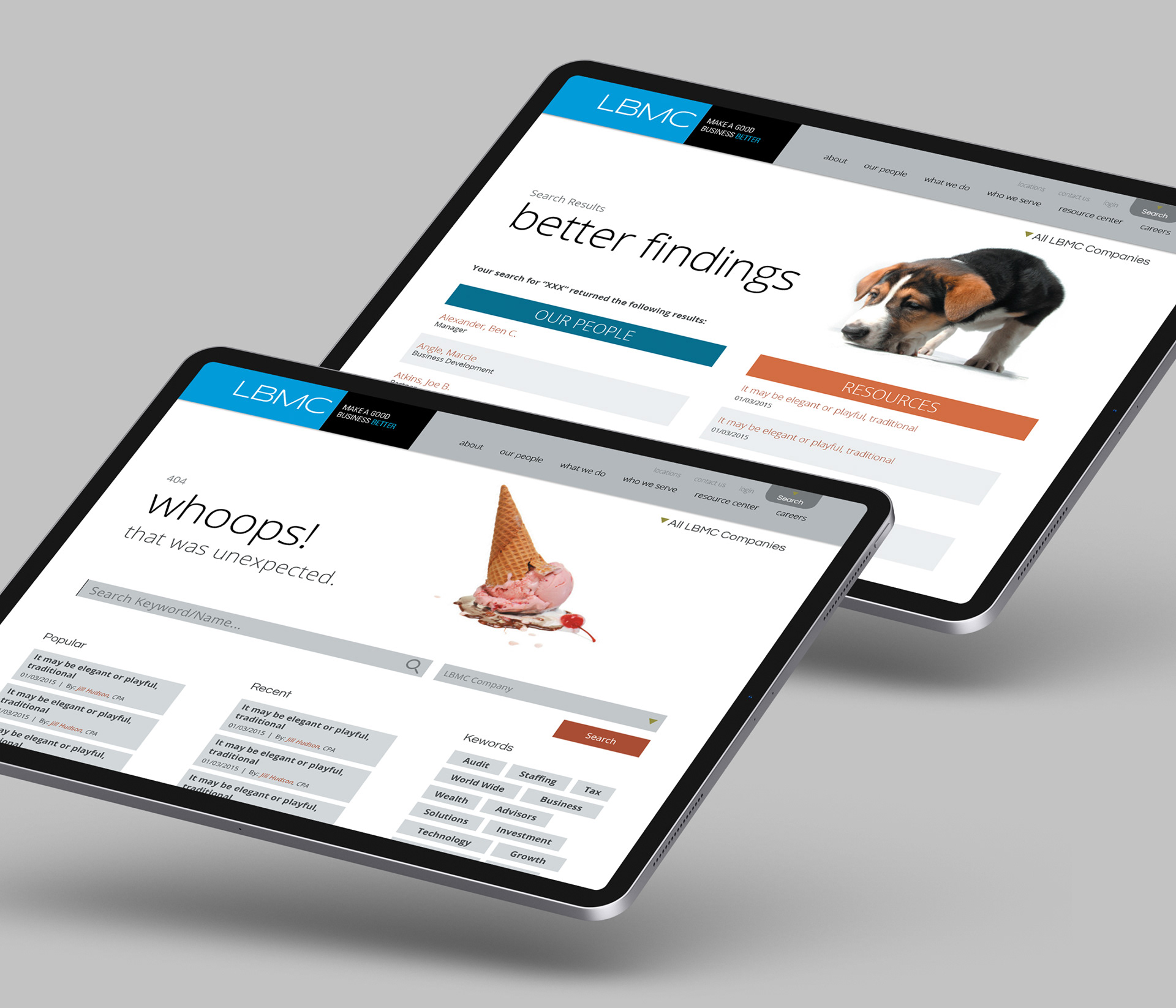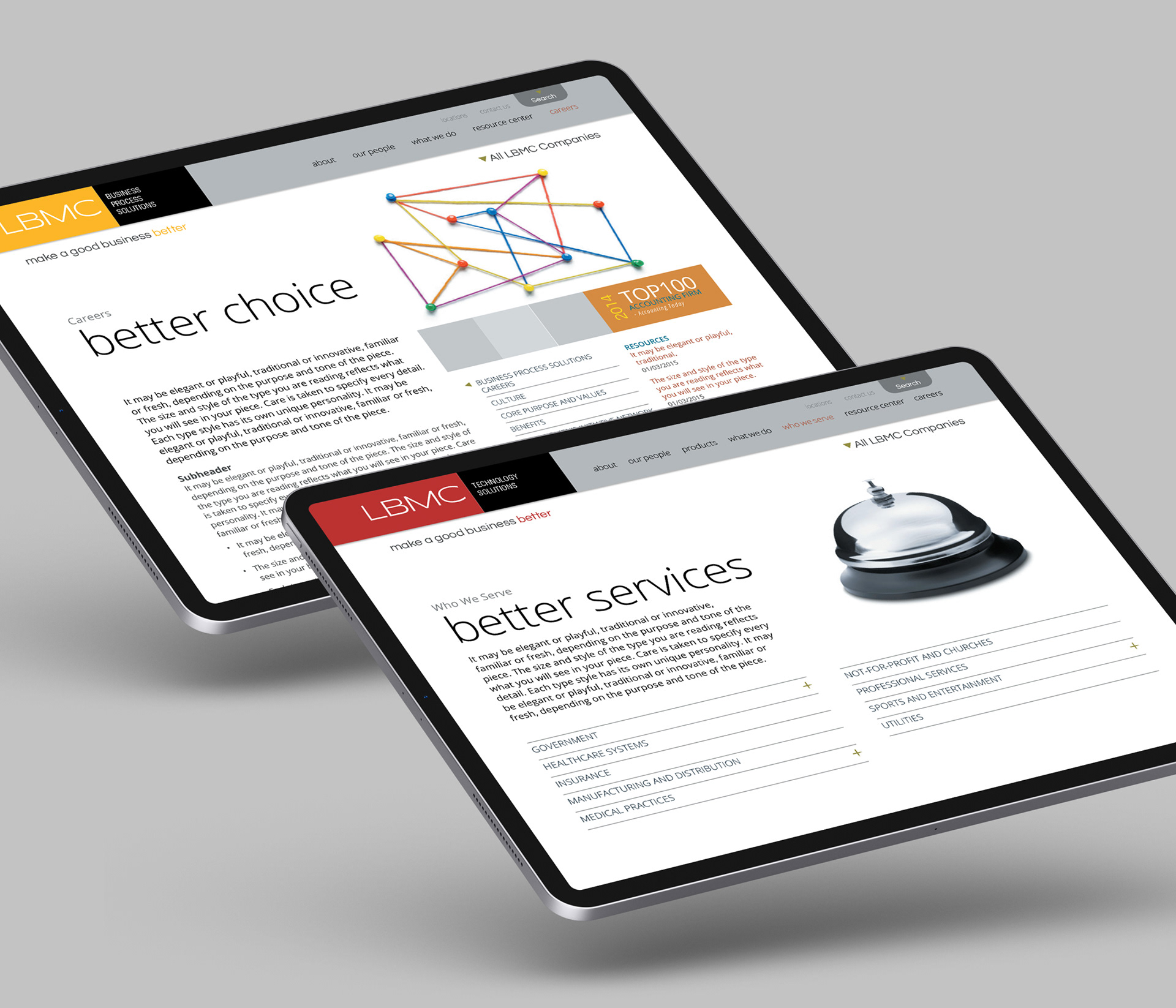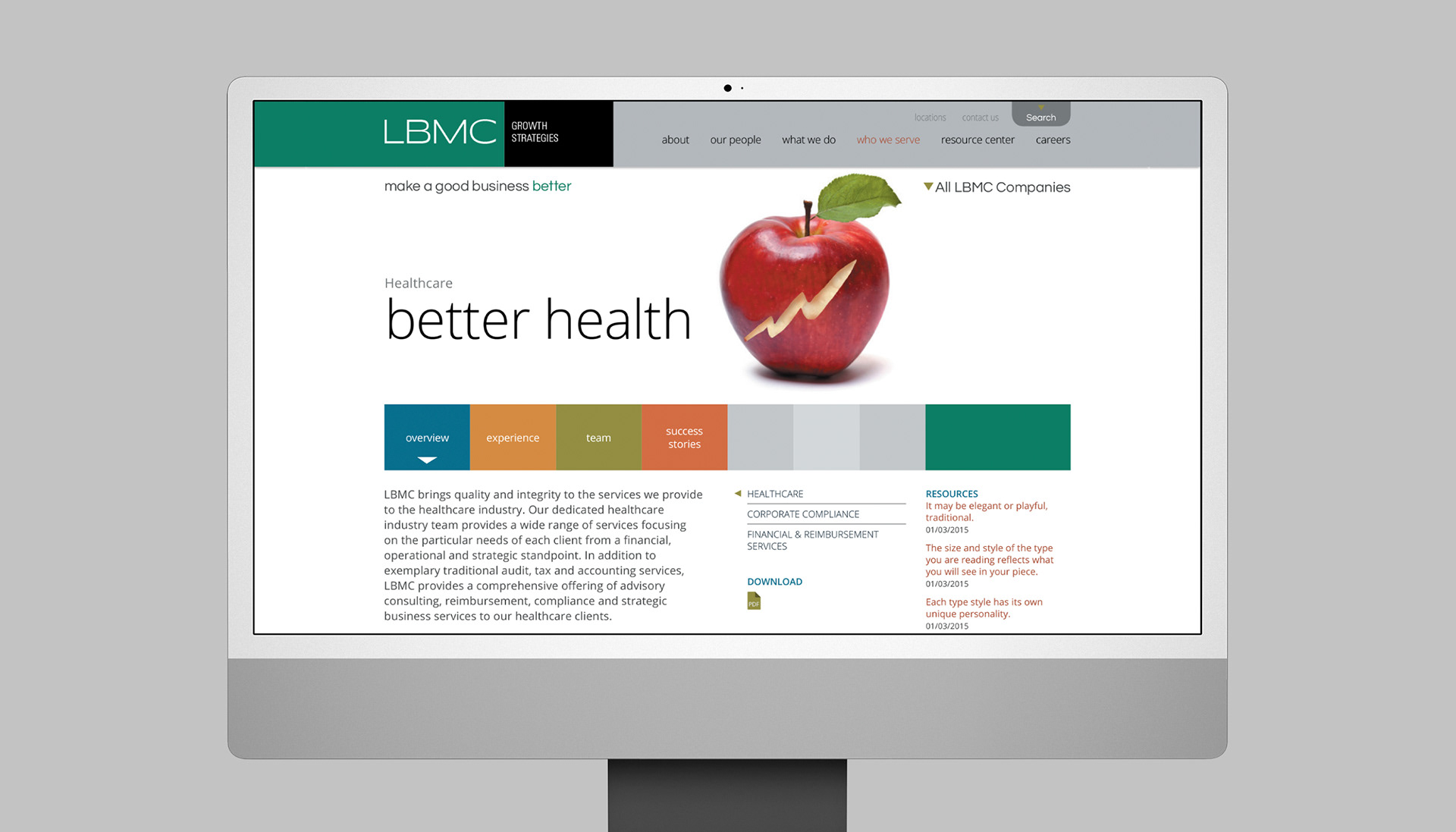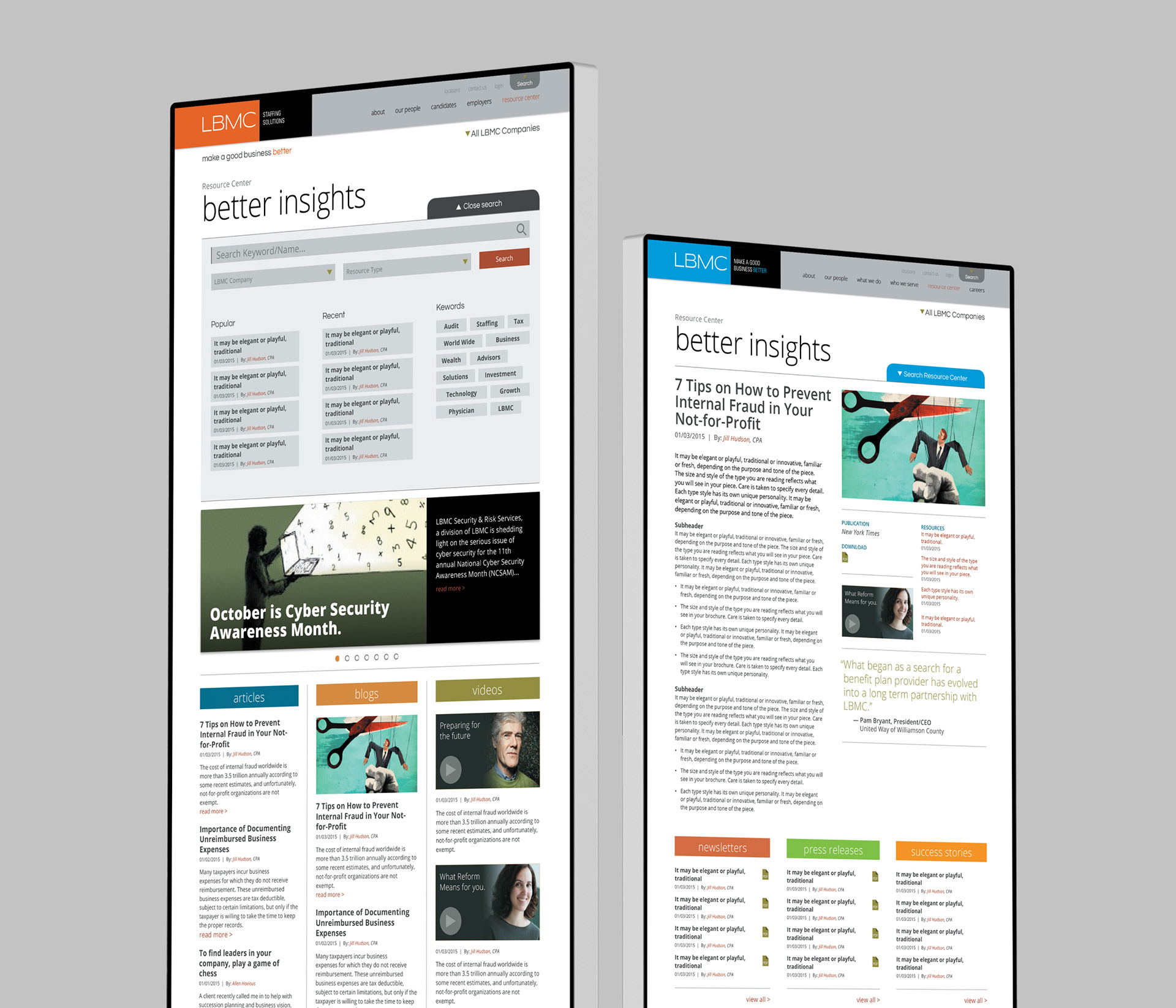 This project is a redesign of the LBMC Website. My role was to take the newly redesigned LBMC brand and flesh out a full responsive corporate website that would encompass all 9 of LBMC's Family of Companies: Audit, Tax & Advisory; Staffing Solutions; Technology Solutions; Employment Partners; Wealth Advisors; Growth Strategies; Information Security; Physician Business Solutions; Business Process Solutions.