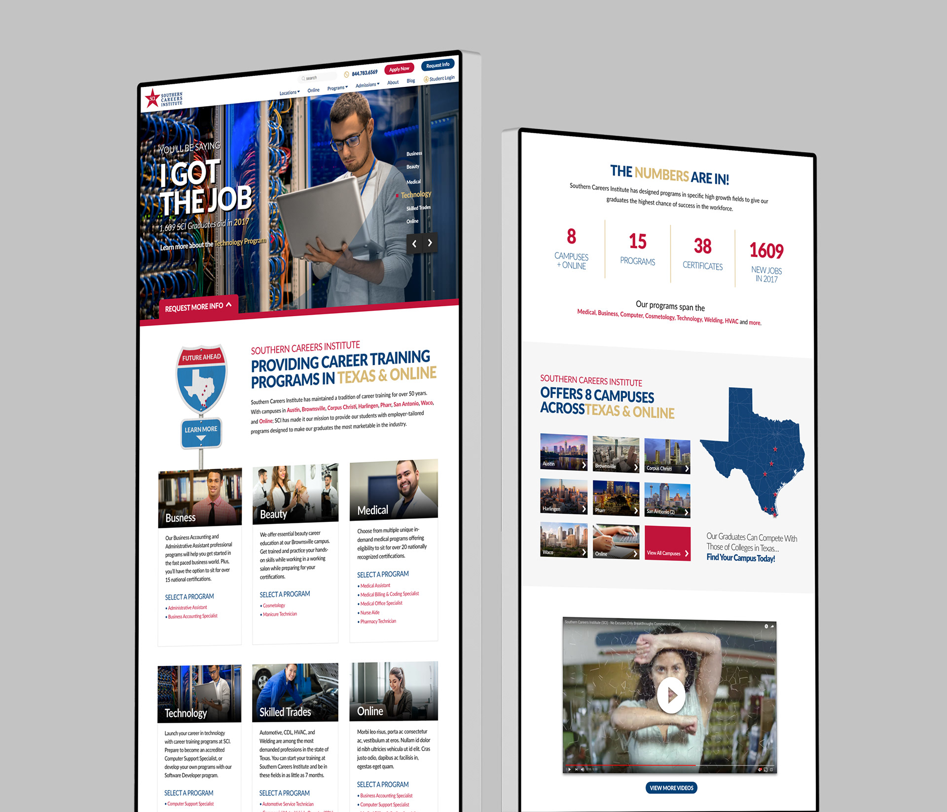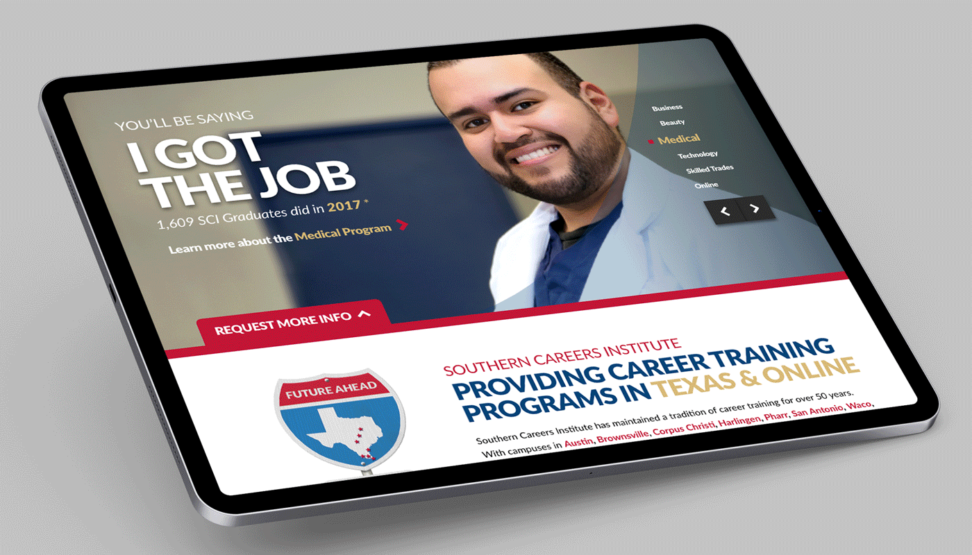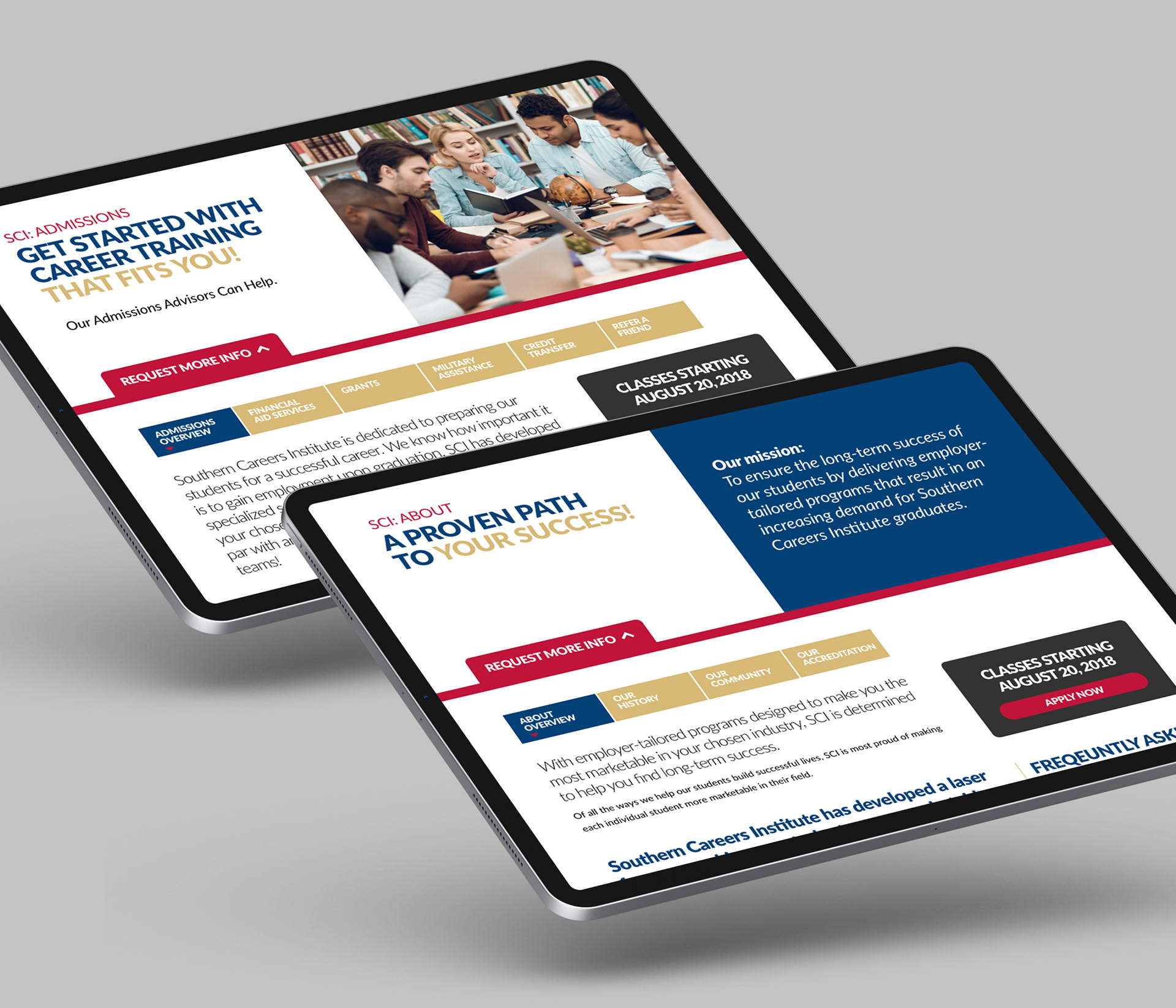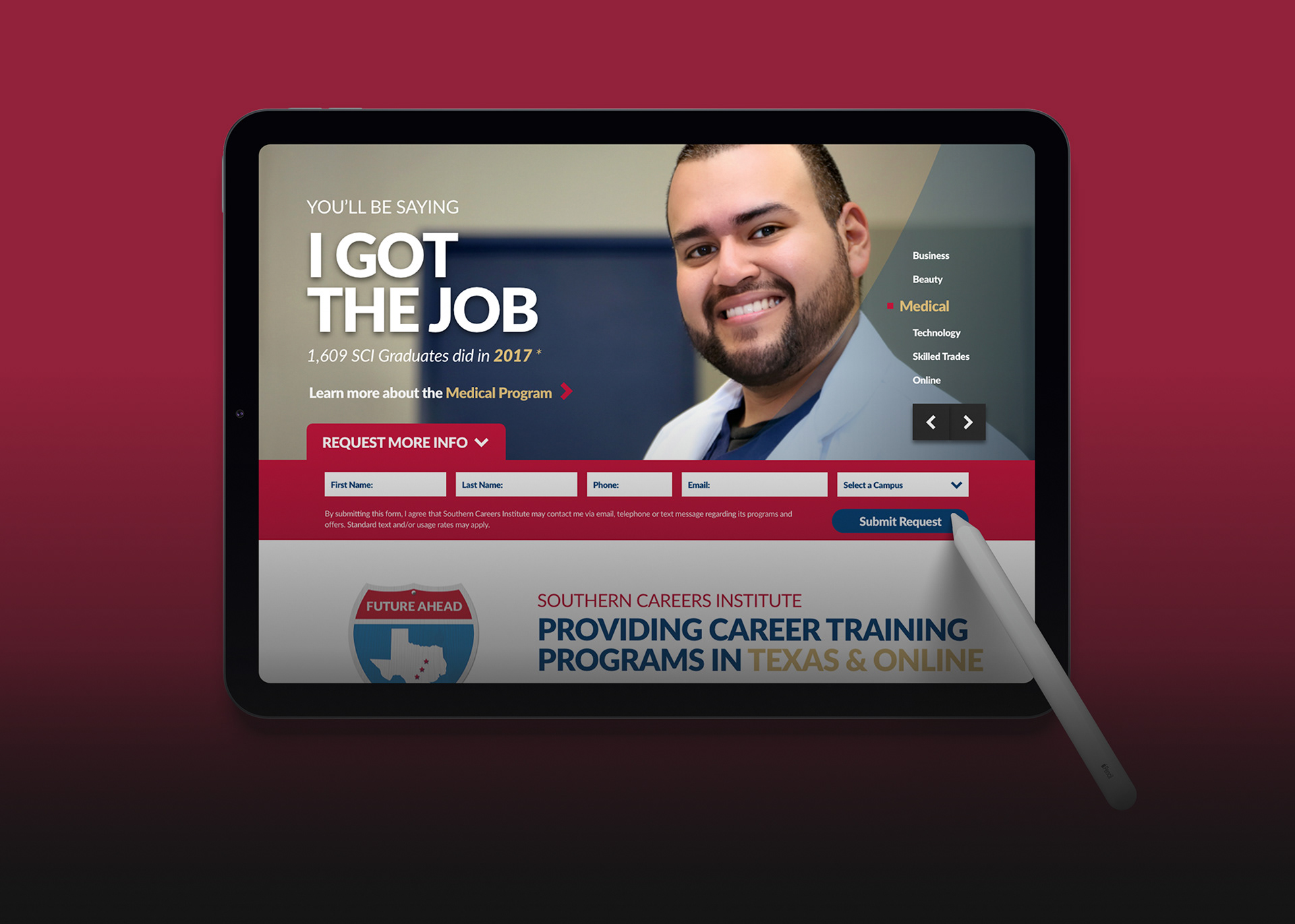 This project initially started as a remote freelance project where I redesigned the homepage. After about a month of work it turned into a full-time position as the Sr. Designer with S.C.I. where I oversaw the design and development of not only their new website but the S.C.I. brand across print pieces, marketing assets, tradeshows, events, and videos for all seven campuses across Texas. This website is just a small snapshot of the work done while working at Southern Careers Institute.