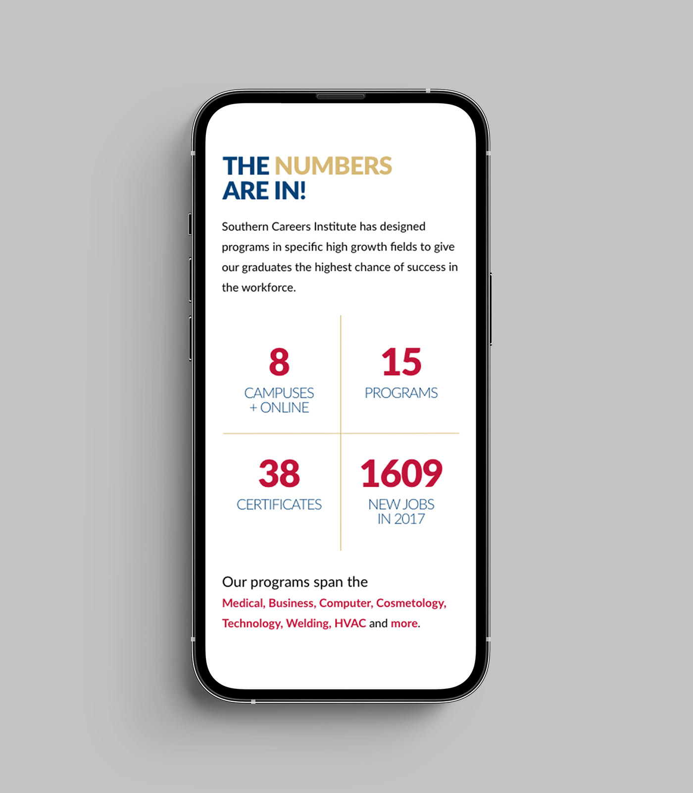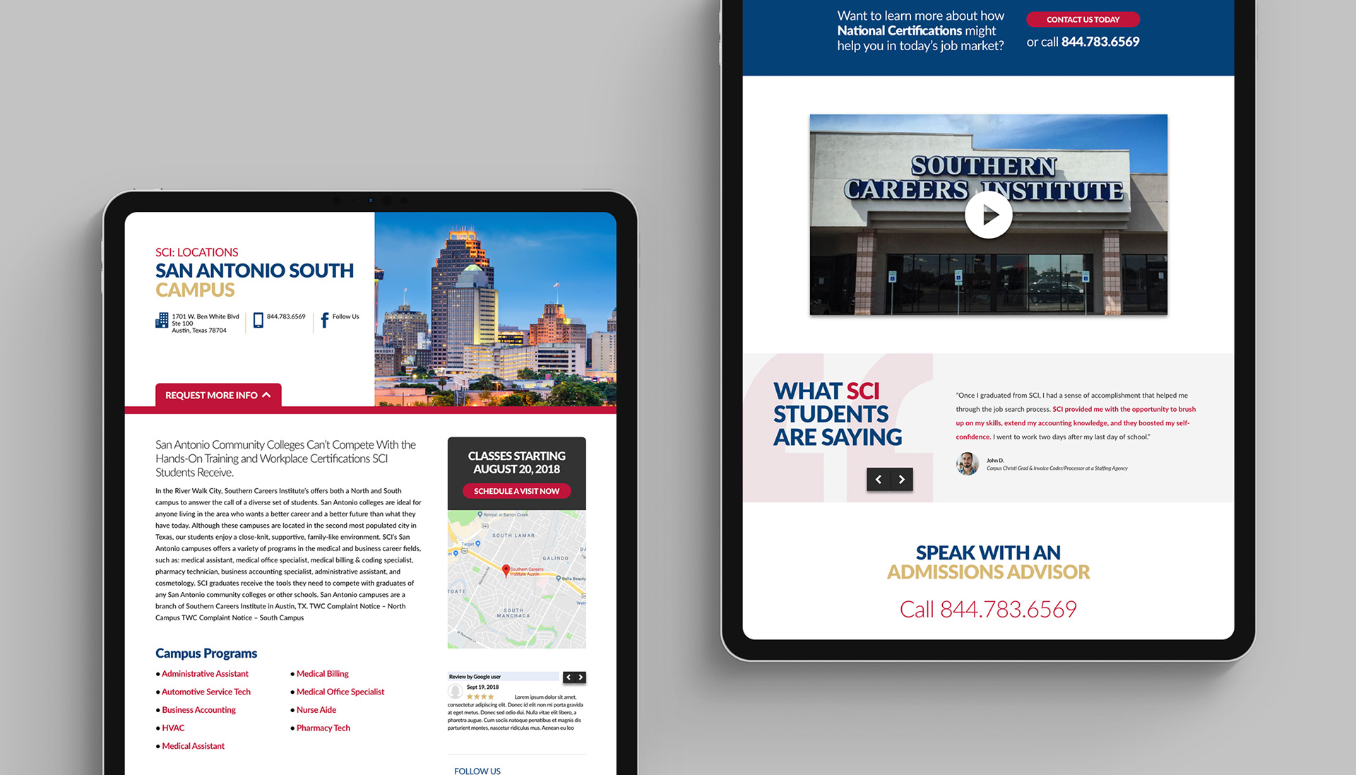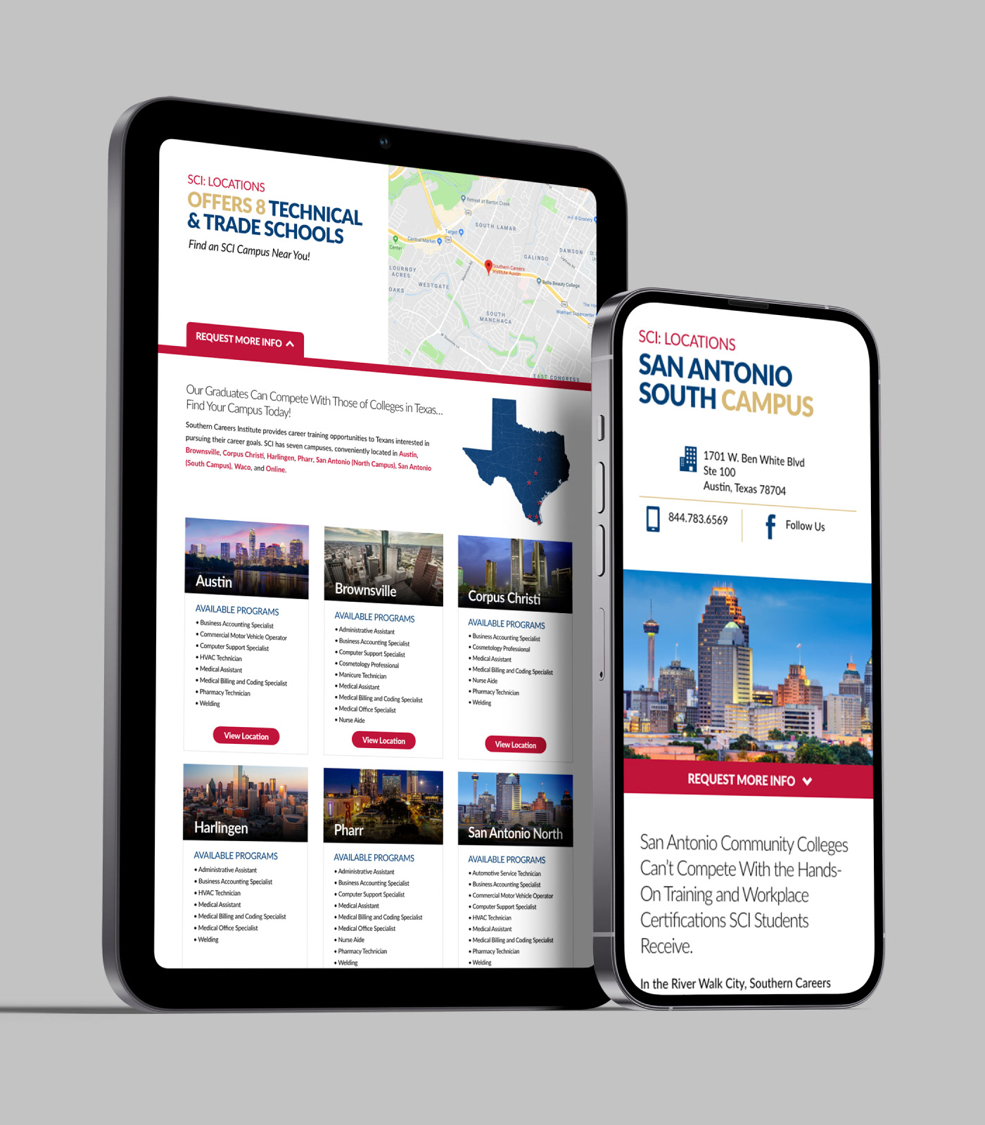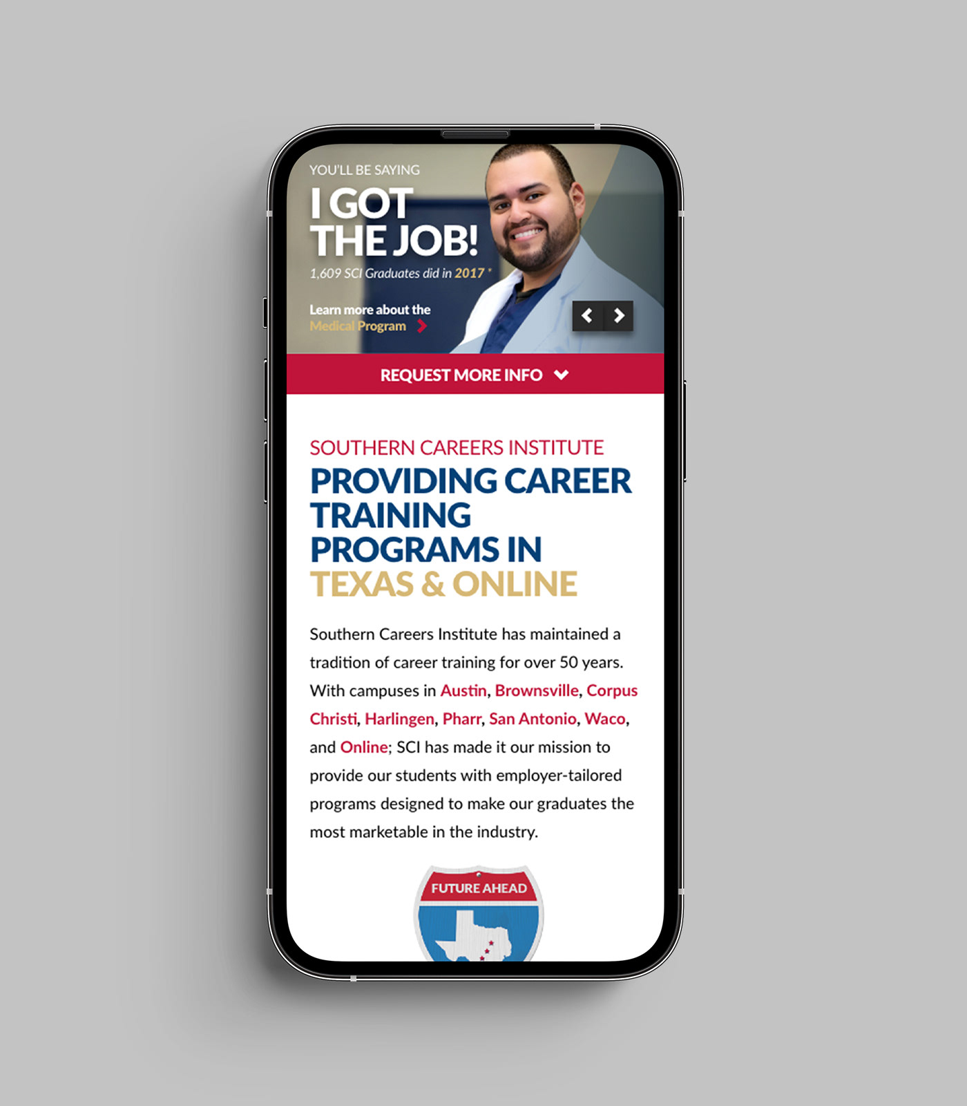 This project initially started as a remote freelance project where I redesigned the homepage. After about a month of work it turned into a full-time position as the Sr. Designer with S.C.I. where I oversaw the design and development of not only their new website but the S.C.I. brand across print pieces, marketing assets, tradeshows, events, and videos for all seven campuses across Texas. This website is just a small snapshot of the work done while working at Southern Careers Institute.
