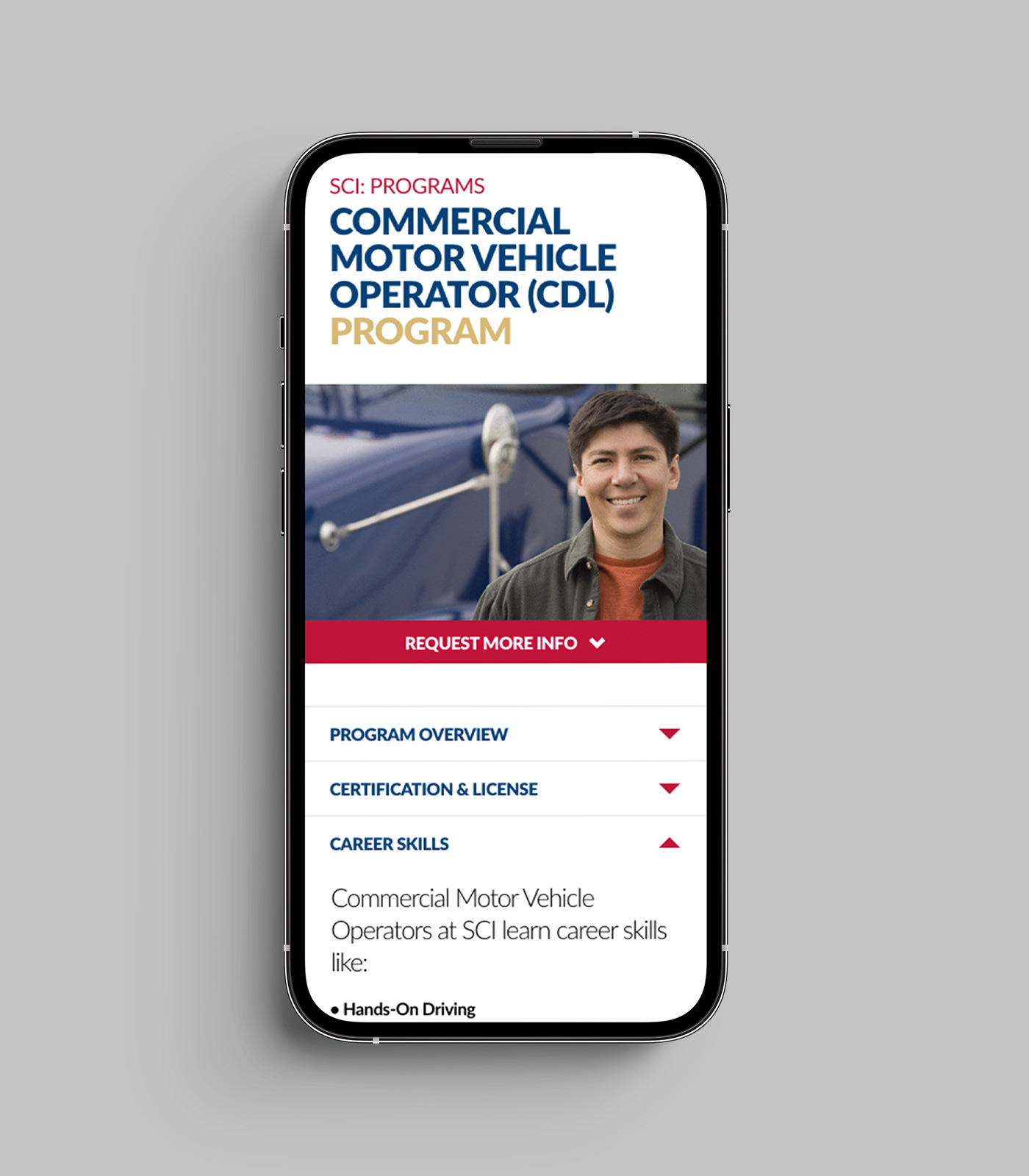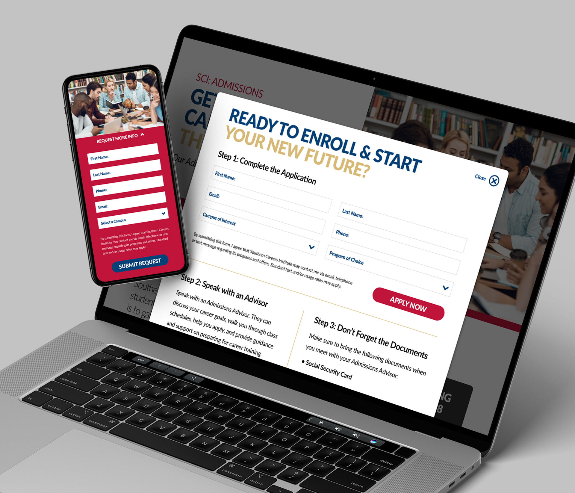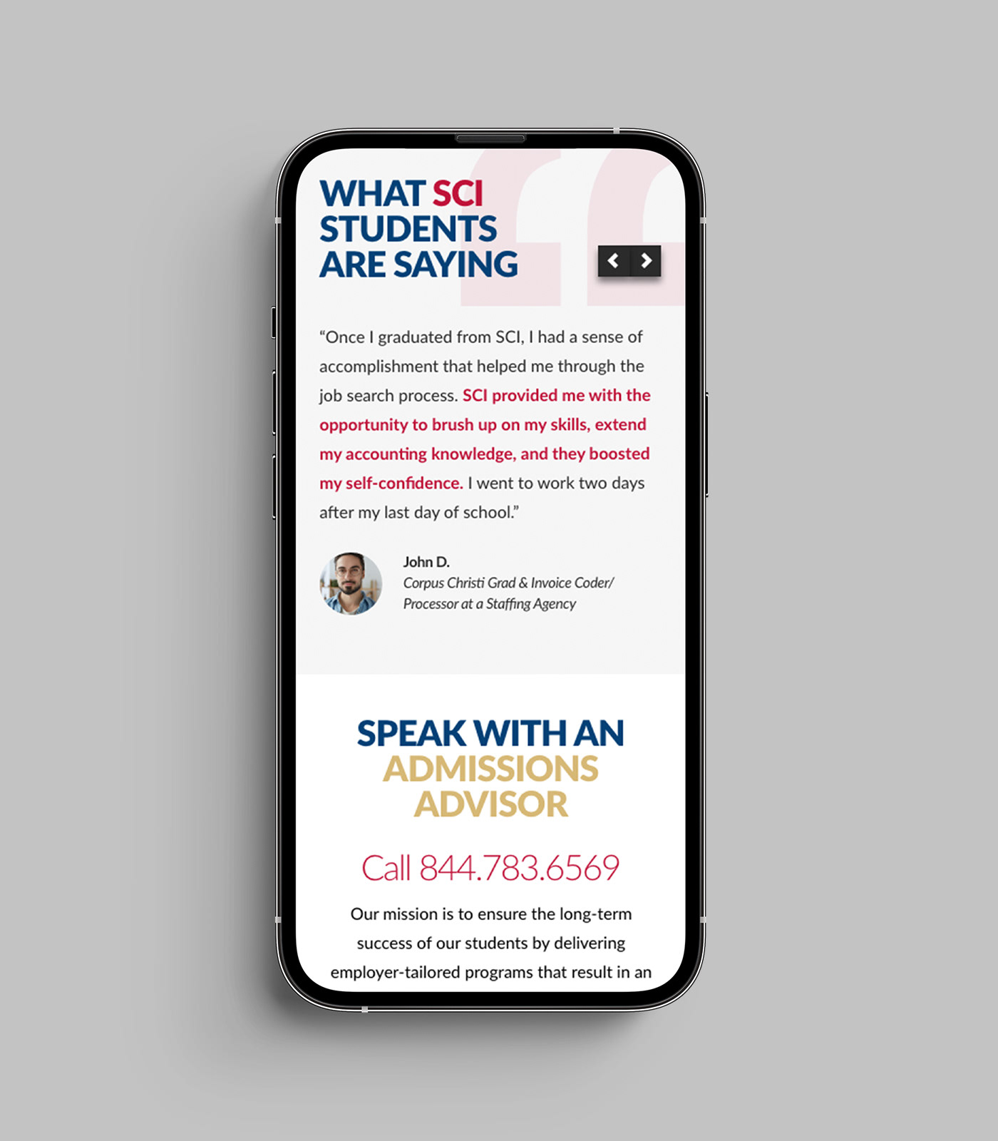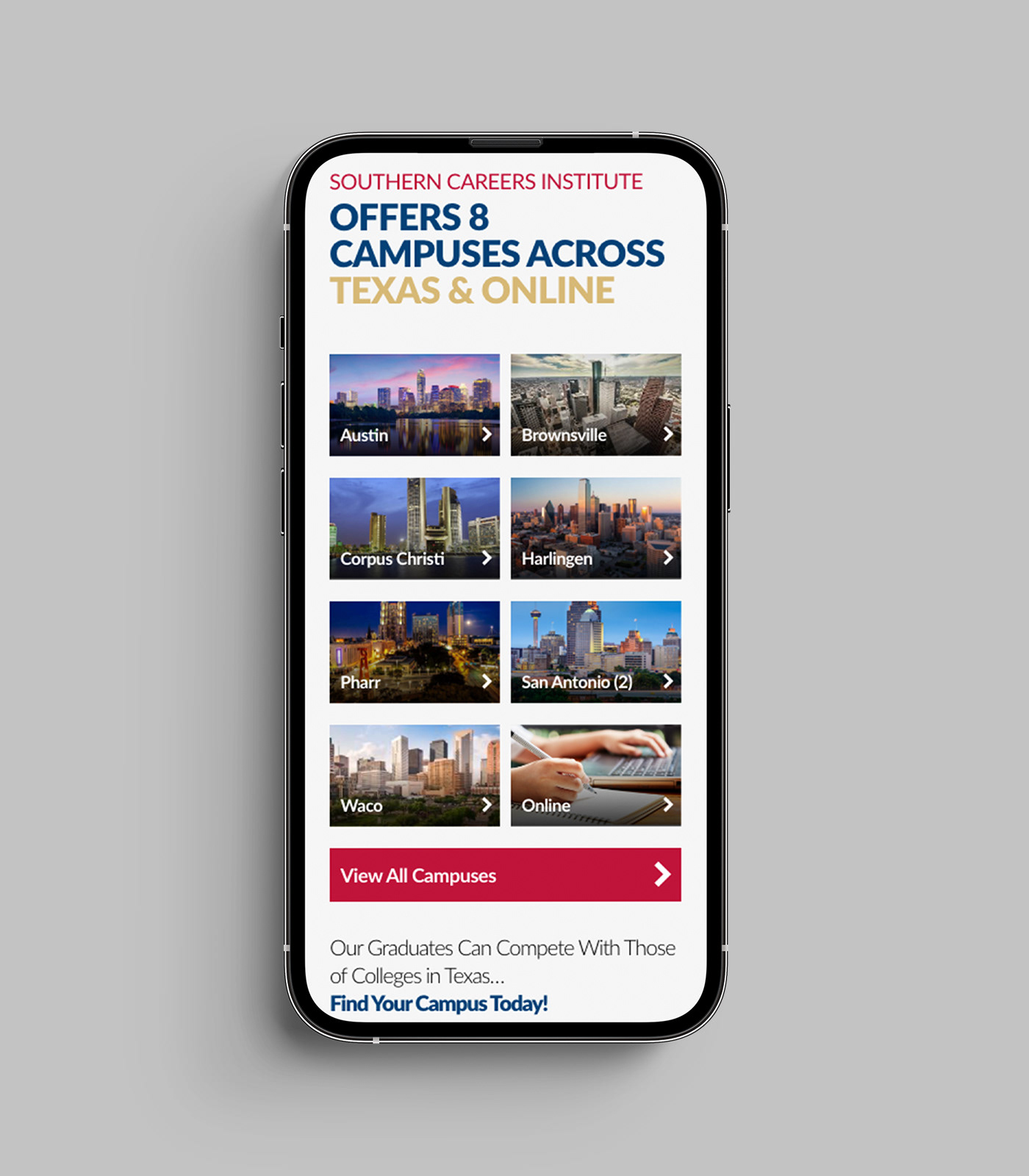 This project initially started as a remote freelance project where I redesigned the homepage. After about a month of work it turned into a full-time position as the Sr. Designer with S.C.I. where I oversaw the design and development of not only their new website but the S.C.I. brand across print pieces, marketing assets, tradeshows, events, and videos for all seven campuses across Texas. This website is just a small snapshot of the work done while working at Southern Careers Institute.
