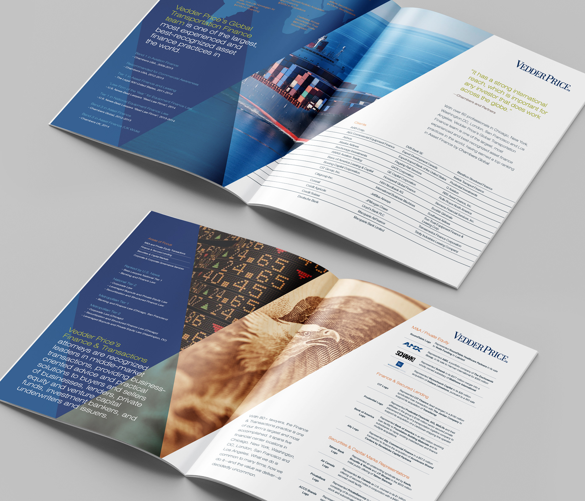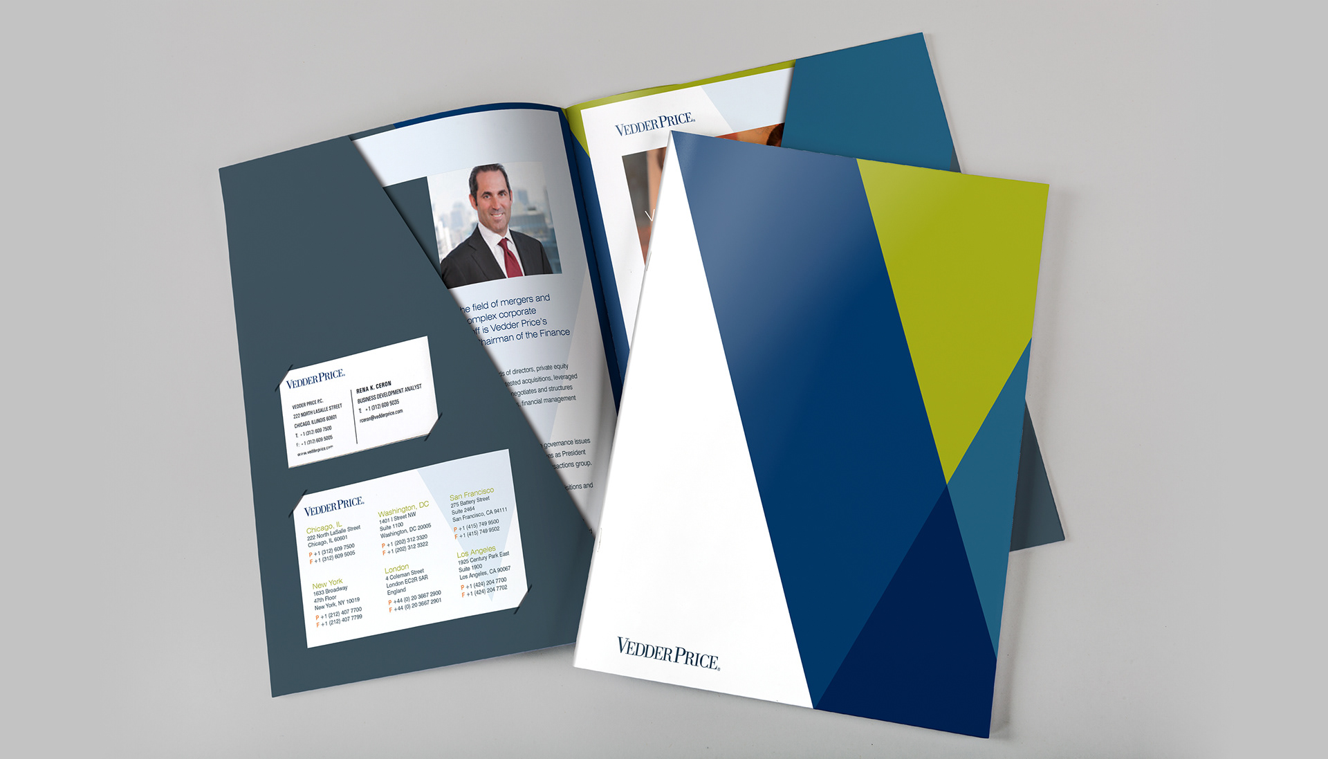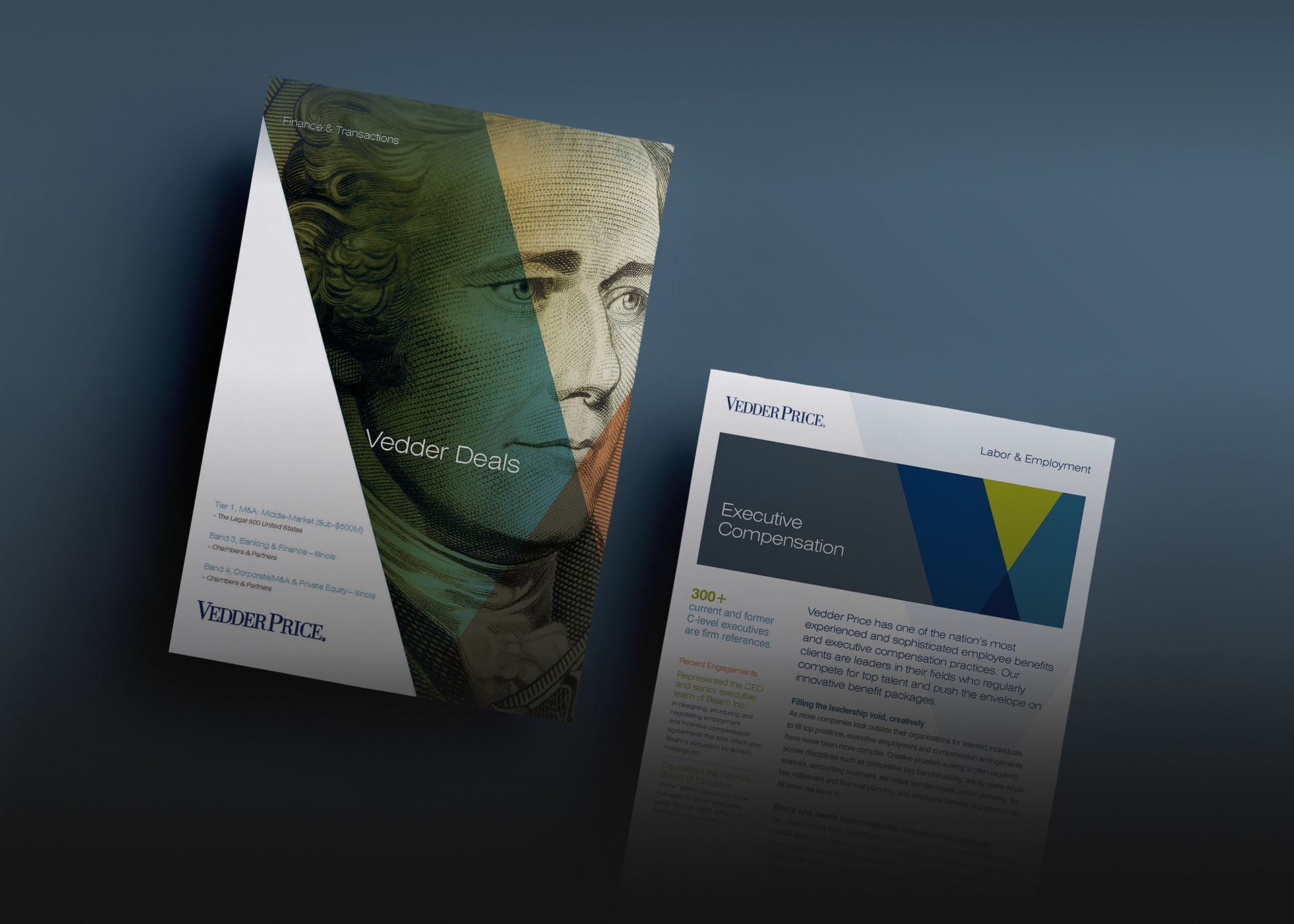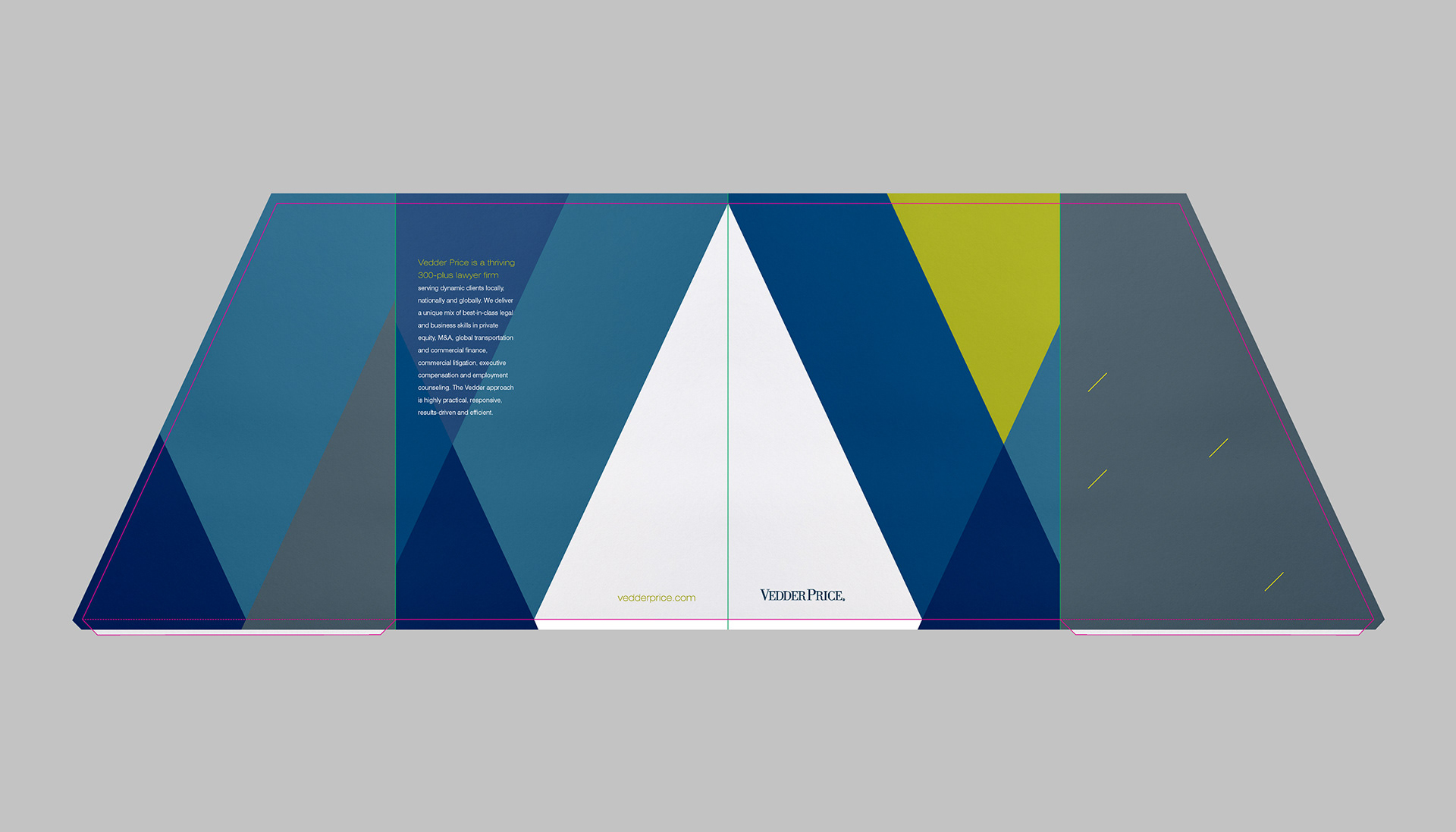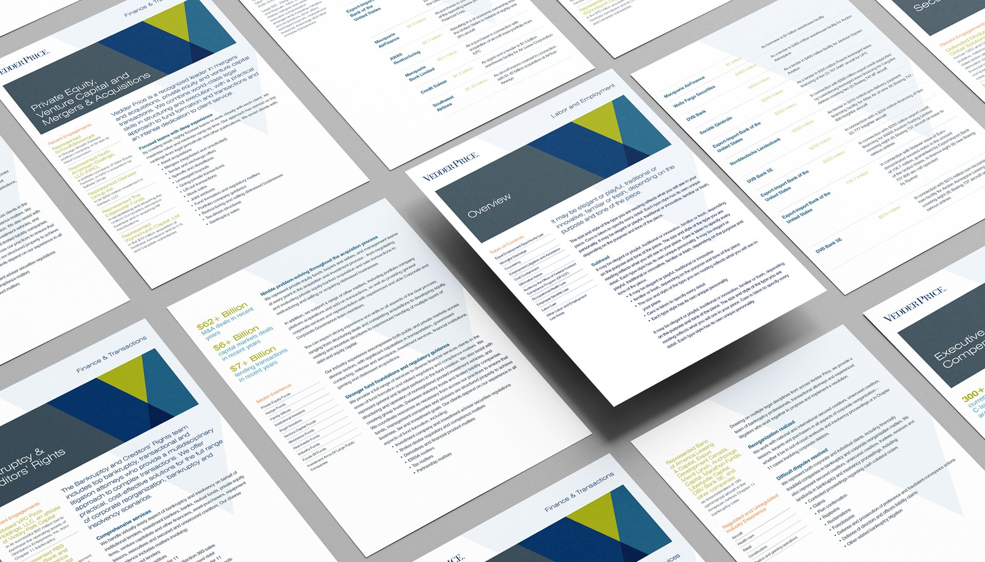 This project consists of a full print collateral system including 2 brochures, 10+ sell sheet templates, and a custom die cut folder with business card and info card holders. My role was to take the newly redesigned Vedder Price brand and extend it into a modular collateral system that each team member could recreate using Microsoft Word and package into a unique folder showcasing their industries and services. The Microsoft Word templates included all font styles, brand colors as theme, and page layout templates.
