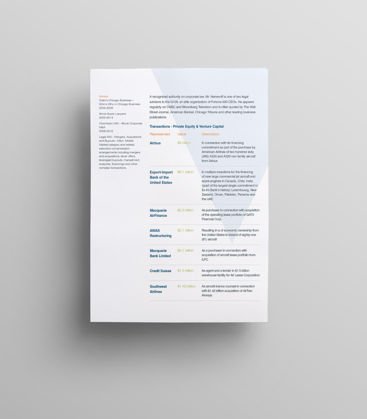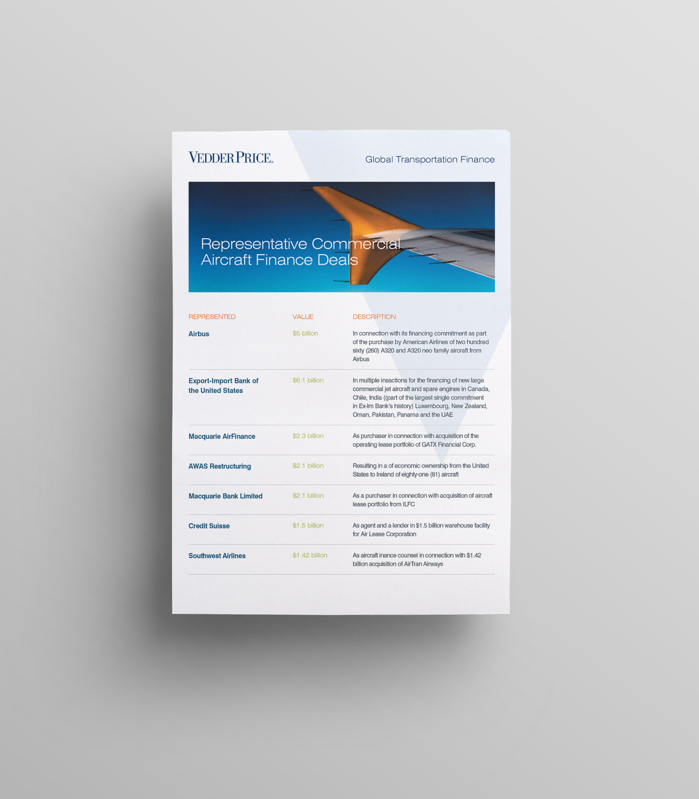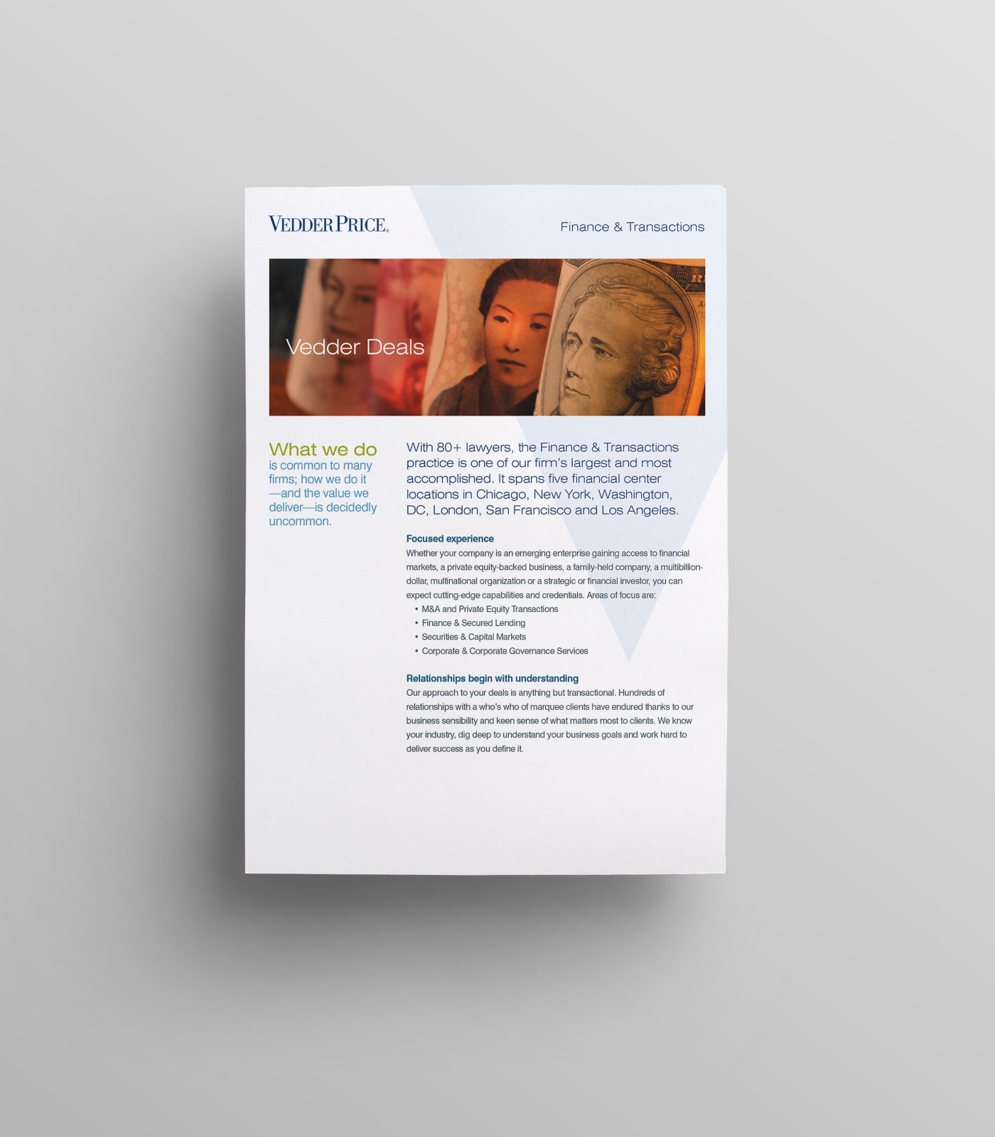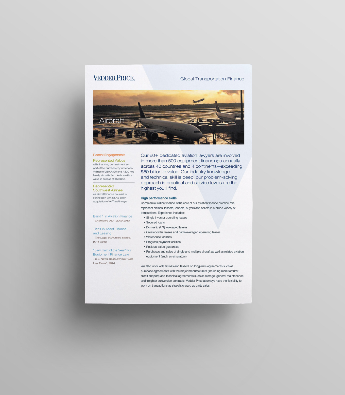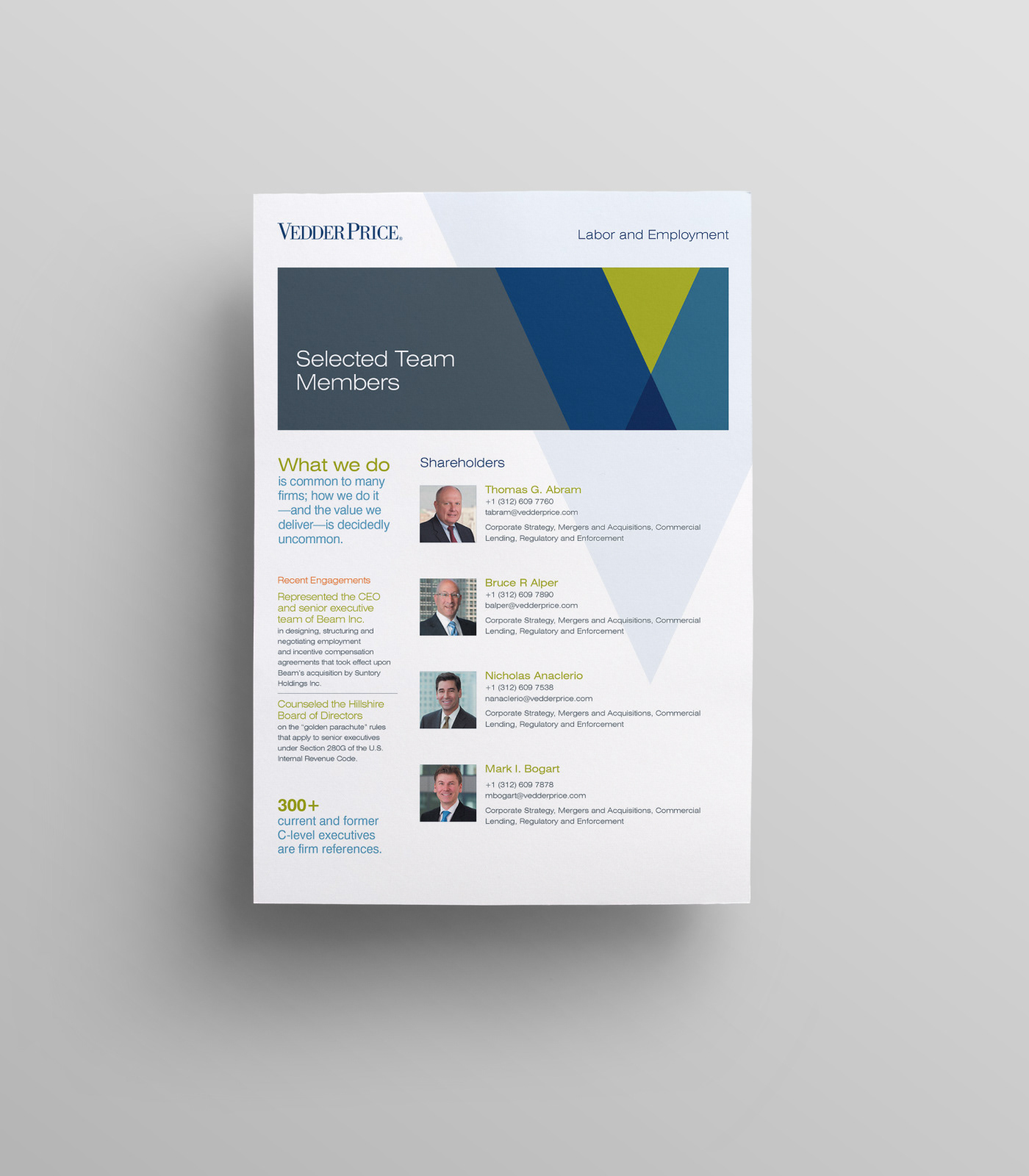 This project consists of a full print collateral system including 2 brochures, 10+ sell sheet templates, and a custom die cut folder with business card and info card holders. My role was to take the newly redesigned Vedder Price brand and extend it into a modular collateral system that each team member could recreate using Microsoft Word and package into a unique folder showcasing their industries and services. The Microsoft Word templates included all font styles, brand colors as theme, and page layout templates.