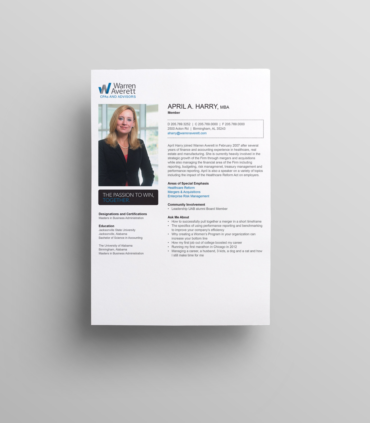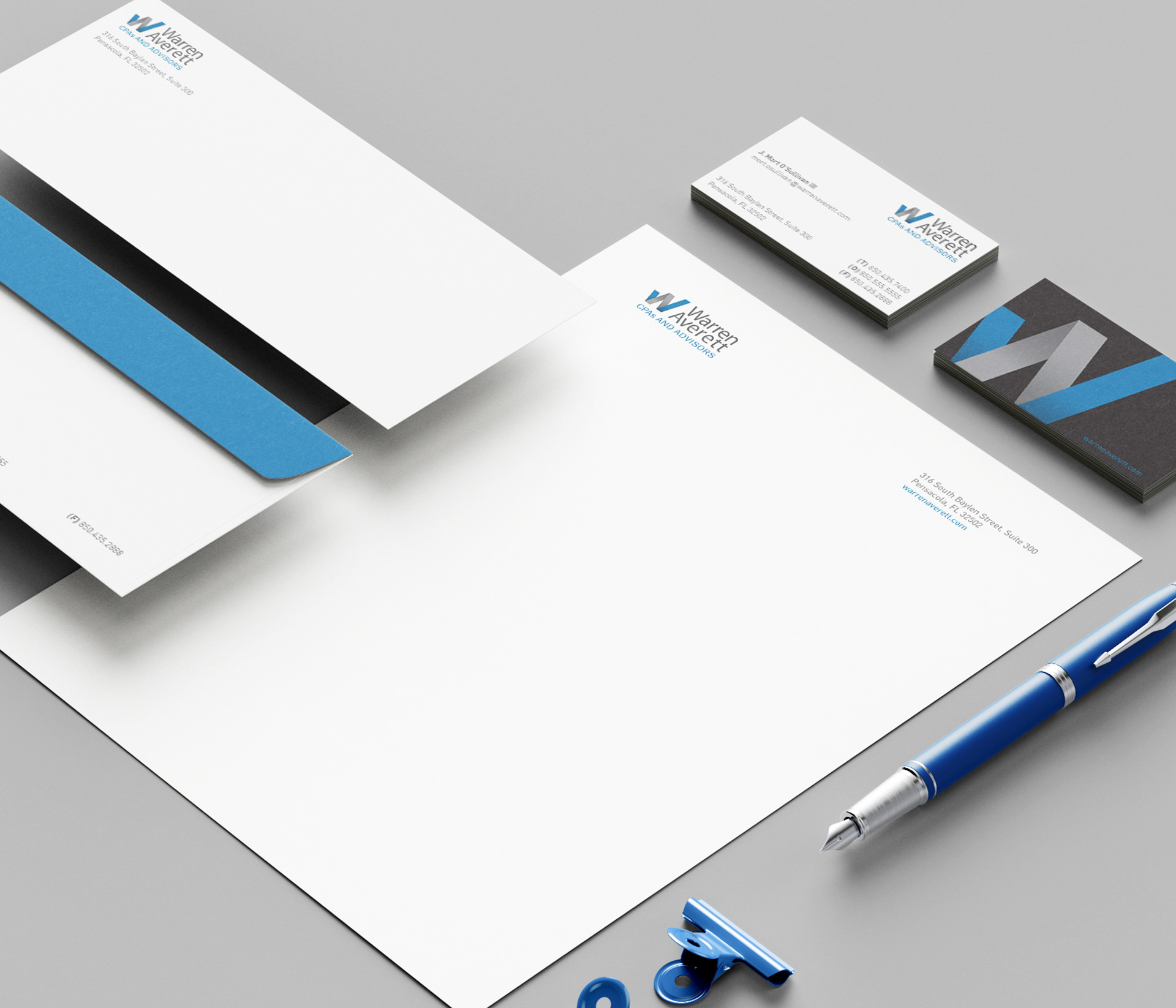 This project consists of a full print collateral system and website redesign. My role was to take the newly redesigned logo and flesh out additional design assets including business cards, stationery sets, bio and sell sheets, brochures, folders, and full websites for both the CPA and Advisors (blue) side and Asset Management (gold) side of Warren Averett.